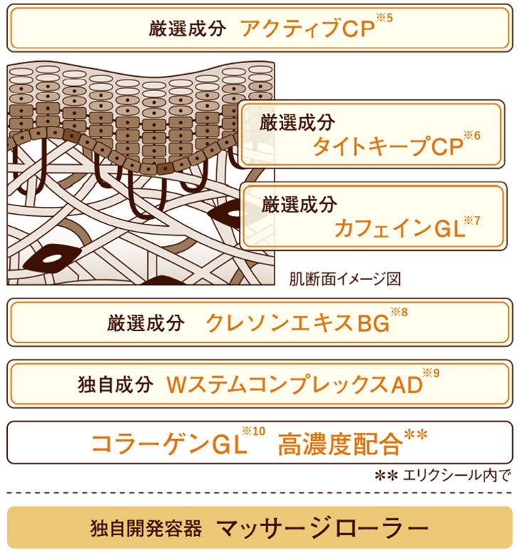 そこで、最新の知見のエッセンスとして、自分の意志では動かすことのできない筋肉「平滑筋※3」に新たに着目しました。年齢と共に深刻化する肌悩みが気になる方に向け、厳選成分配合の先進の美容液をエリクシール独自開発のマッサージローラーで頬やフェイスラインの筋肉の流れに沿って引き上げながらなじませ、「つや玉」さらに輝く肌へ導く美容液、「エリクシール エステティックエッセンス AD」を発売します。「表情筋」や、今回あらたに着目した「平滑筋※3」を意識しながらマッサージローラーを転がすことで、心地よいお手入れを実現します。