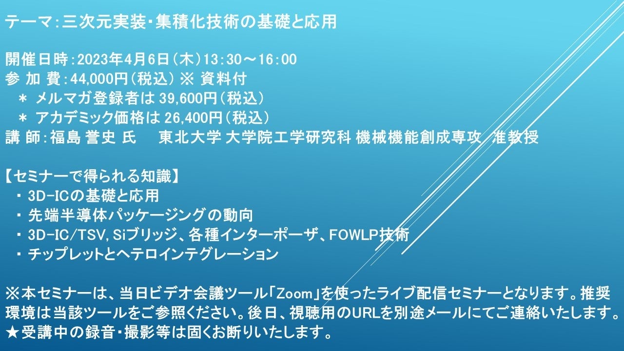 先端技術情報や市場情報を提供している(株)シーエムシー・リサーチ(千代田区神田錦町: https://cmcre.com/ )では、 各種材料・化学品などの市場動向・技術動向のセミナーや書籍発行を行っておりますが、 このたび「三次元実装・集積化技術の基礎と応用」と題するセミナーを、 講師に福島 誉史 氏 (東北大学 大学院工学研究科 機械機能創成専攻 准教授)をお迎えし、2023年4月6日(木)13:30より、 ZOOMを利用したライブ配信で開催いたします。 受講料は、 一般:44,000円(税込)、 弊社メルマガ会員:39,600円(税込)、 アカデミック価格は26,400円(税込)となっております(資料付)。