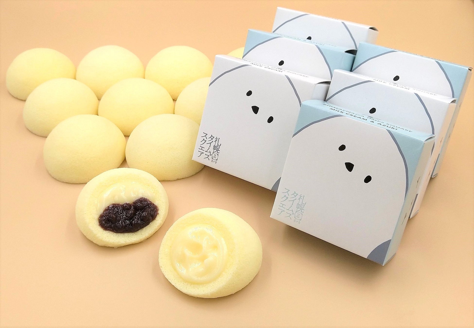 日本では北海道にしか生息しない野鳥「シマエナガ」のデザインのタイムズスクエアです。ふわふわのスポンジ生地でミルククリームを包んだ「ミルク」味と北海道産小豆を炊いたアズキあんとミルククリームを包んだ「ミルク&アズキ」の2種類です。