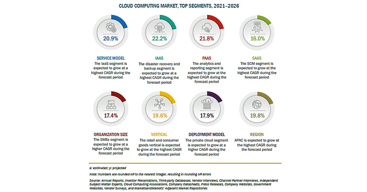 クラウドコンピューティングの市場規模は、2021年の4,453億米ドルからCAGR16.3%で成長し、2026年には9,473億米ドルに達すると予測されています。APAC(アジア太平洋)地域での技導入は増加したものの、全体としてCOVID-19パンデミックによる影響が心配されています。企業のビジネス機能の維持にWFH(ワークフロムホーム)を採用している分野で、同市場が拡大することが予想されます。