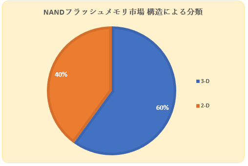 3D 構造は、構造カテゴリの主要なサブセグメントです。3D NAND フラッシュは、2D NAND フラッシュと比較して、優れたストレージ容量、つまりデータ密度を提供します。複数の層のメモリセルを積み重ねることによって作成された3次元ストレージマトリックスは、同じチップ面積でストレージ容量を向上させることができます。