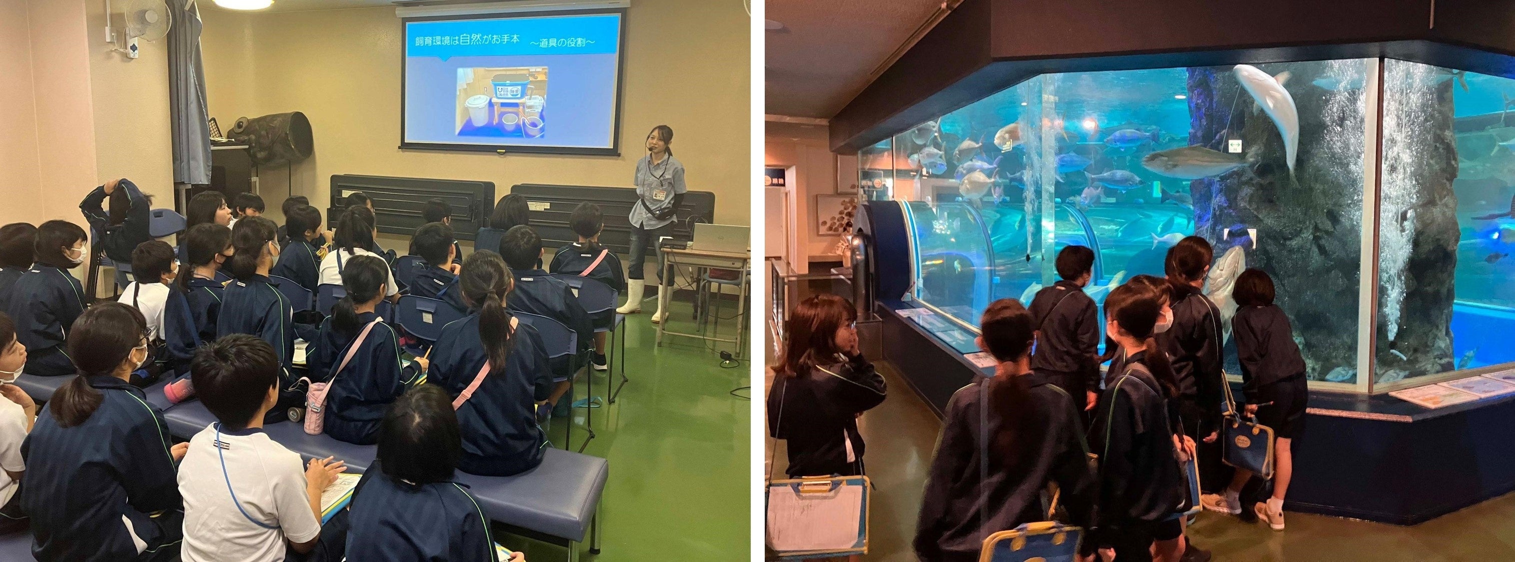 第1回の特別授業は「魚津水族館」の見学を行いました。水族館では、大水槽のバックヤードを見学。水族館の水槽や濾過システムは、小学校にある養殖で使用している水槽と同じ仕組みでできているということを知り、児童たちはその大きさと数の違いに驚いていました。