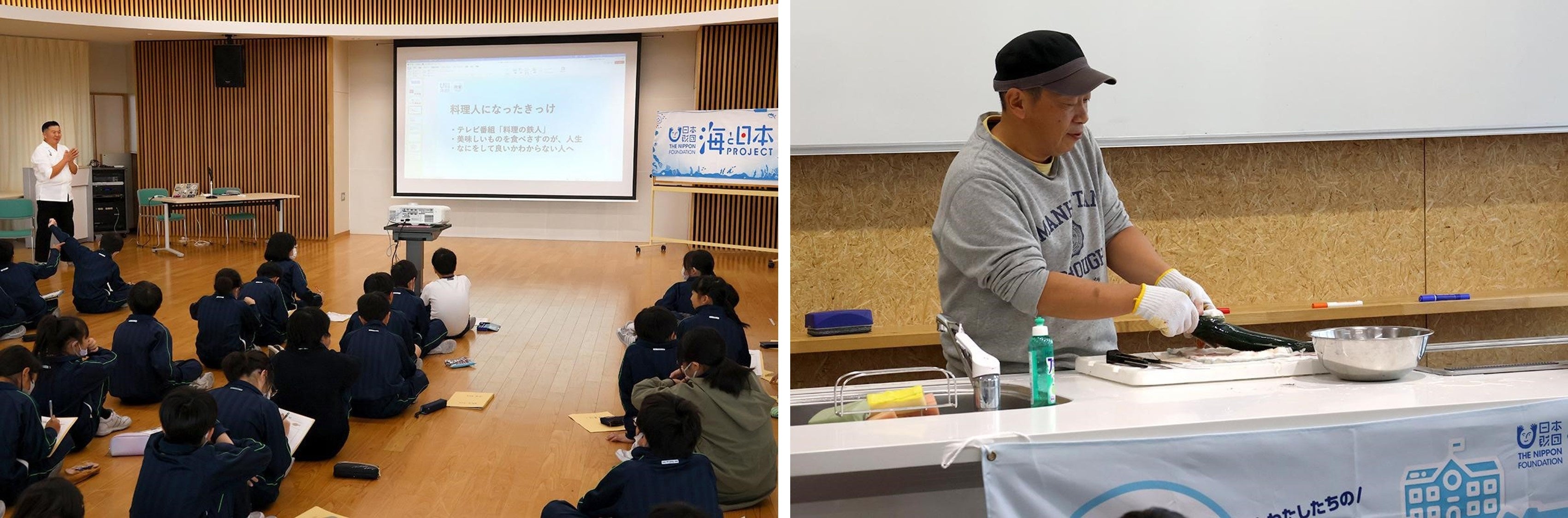 授業ではまず、地元の魚津の日本料理店で料理長を務める、海野文章さん(四季料理 悠 料理長)が講演を行いました。料理人になったきっかけや、食材へのこだわり、食材を食べるということについて、ご自身の経験や思いを説明。魚も野菜も生き物であり、生き物は完璧に使い切るというこだわりや、食べるということは命で支えられていることであり感謝の気持ちをもつことが大事であるというお話に、児童たちは真剣に耳を傾けていました。質疑応答では「料理を美味しく作るコツは?」「一番難しい料理は?」など積極的に質問をしていました。