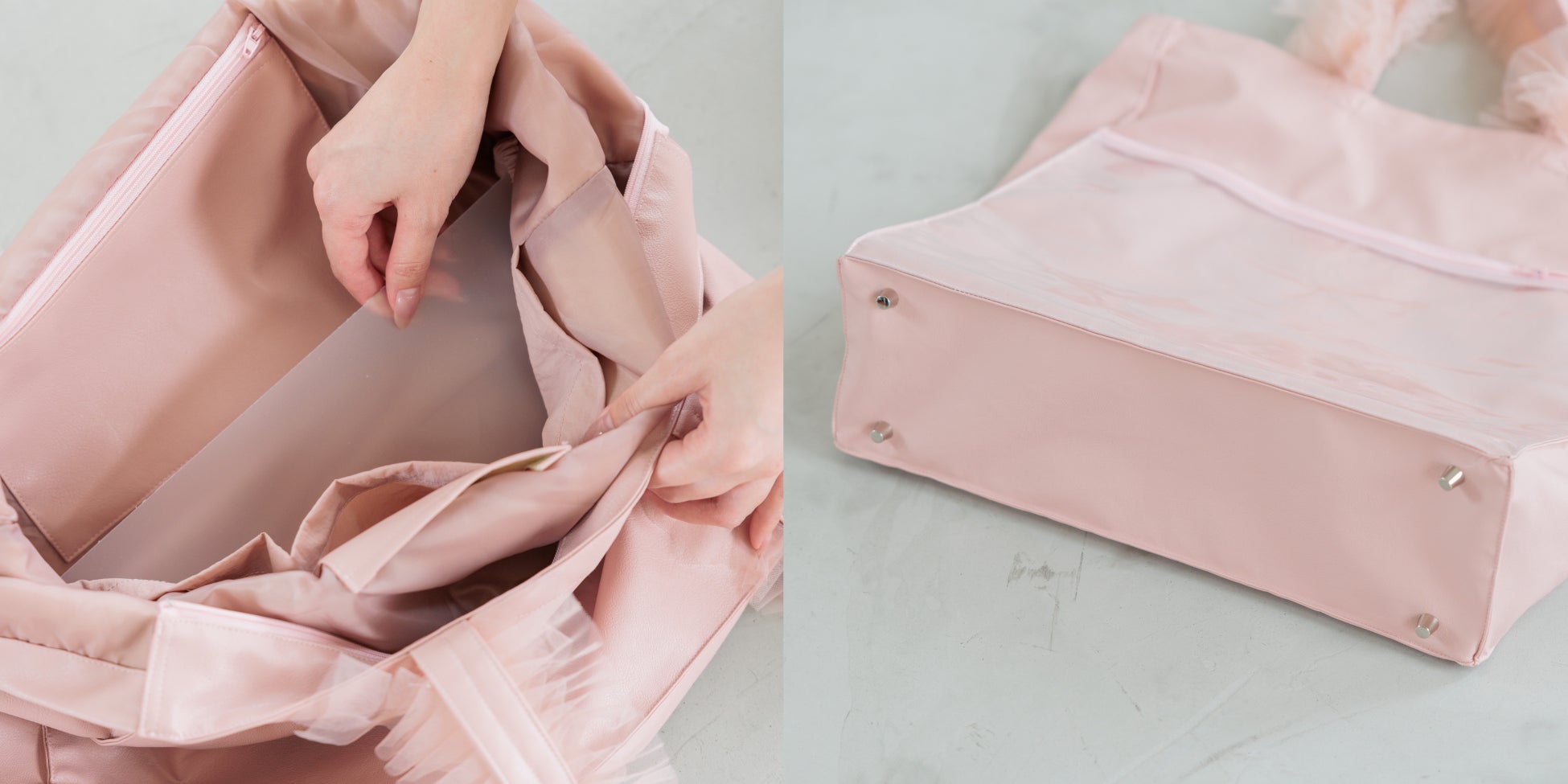 バッグは地面に置くことも多いため底鋲を付け、中敷を入れて強度を上げました。重たい荷物を入れても安心です。