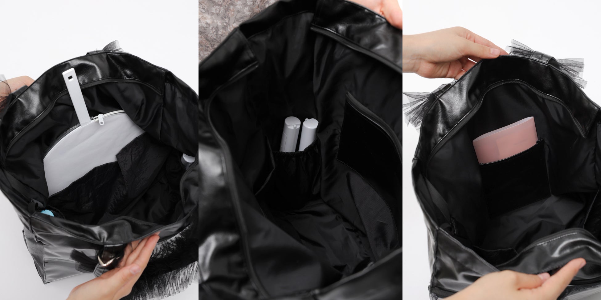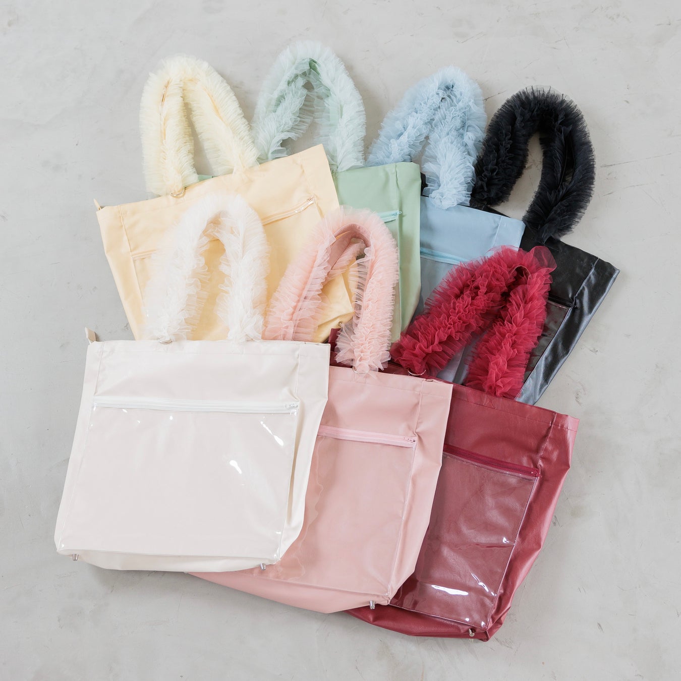 ミスティウーマンらしく大人かわいいチュールフリルの持ち手が特徴的な大容量トートバッグ。外側片方にはチャック付きのポケットがあり、バッジを敷き詰めた痛バッグにもできる仕様です。アイドル、アニメ、観劇、様々な界隈に対応!推し活以外にも、マザーズバッグや普段使いも可能です。