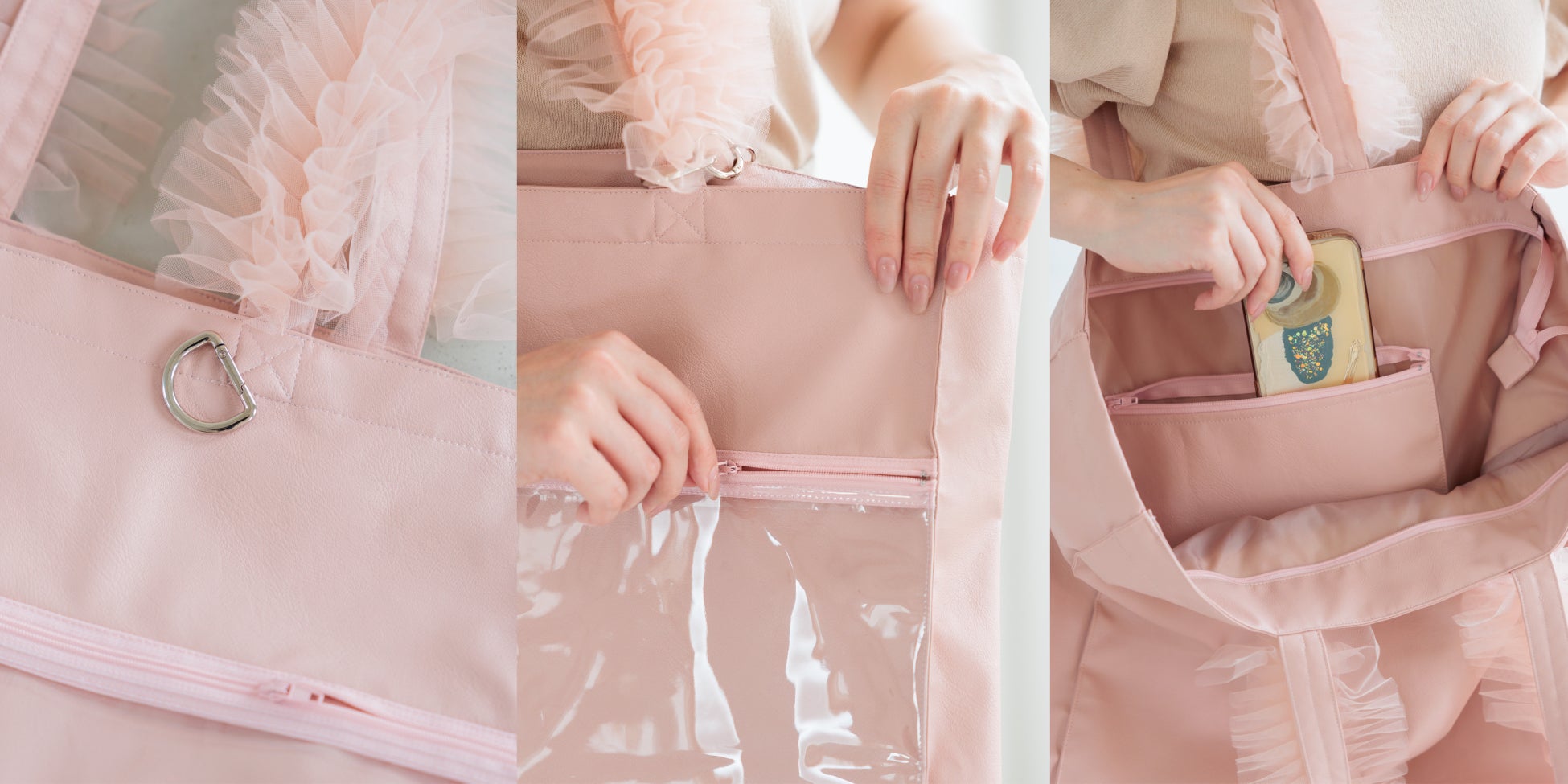 20代、30代のお客さまが多いミスティウーマンが、大人かわいいデザインの推し活バッグを発売します。アイドル、アニメ、観劇など、世の中の推し活ブームを後押しする推し活バッグは、側面にチャック付きのクリアポケットを配置し、痛バッグ(いたバッグ)にもできる仕様です。ミスティウーマンらしいチュールデザインで、今まで以上に推し活に没頭できる映えトートバッグです。