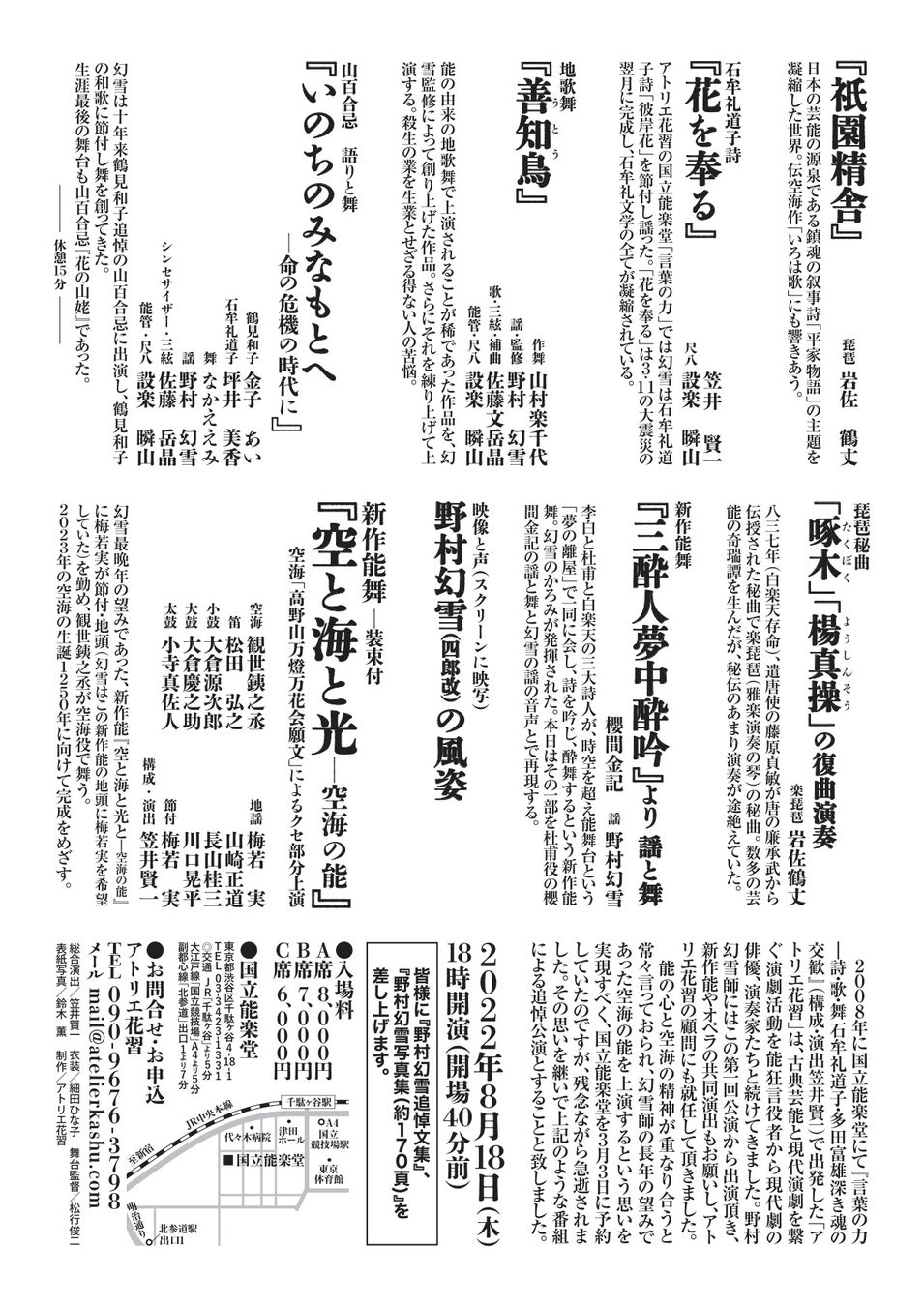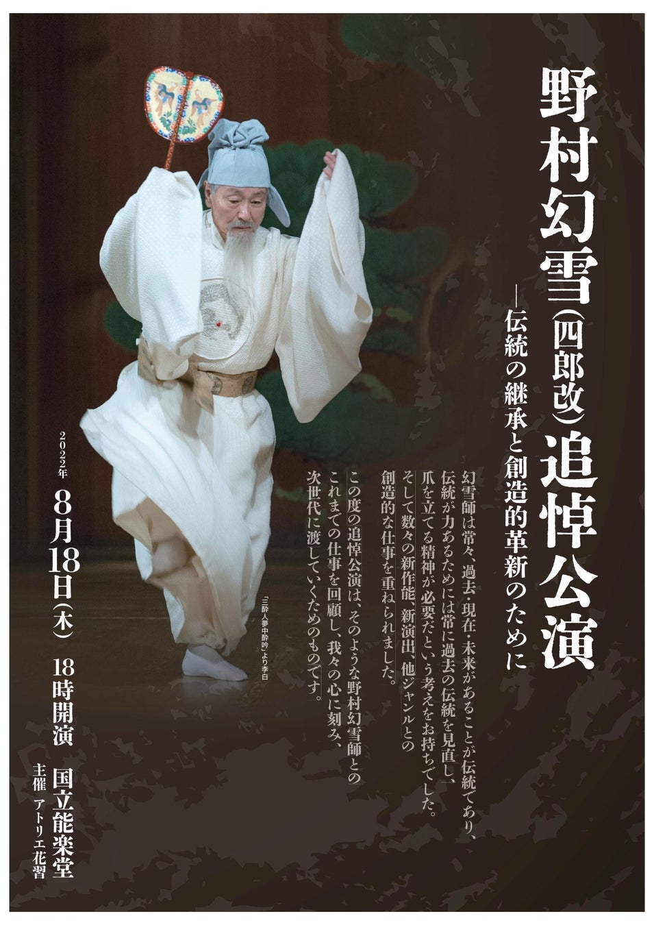 幻雪師は常々、過去・現在・未来があることが伝統であり、伝統が力あるためには常に過去の伝統を見直し、爪を立てる精神が必要だという考えをお持ちでした。そして数々の新作能、新演出、他ジャンルとの創造的な仕事を重ねられてました。この度の追悼公演は、そのような野村幻雪師とのこれまでの仕事を回顧し、我々の心に刻み、次世代に渡していくためのものです。