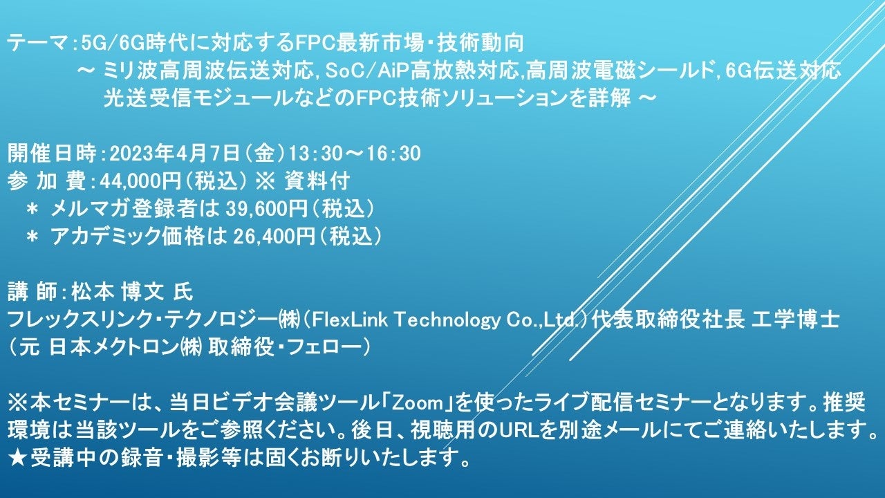 先端技術情報や市場情報を提供している(株)シーエムシー・リサーチ(千代田区神田錦町: https://cmcre.com/ )では、 各種材料・化学品などの市場動向・技術動向のセミナーや書籍発行を行っておりますが、 このたび「5G/6G時代に対応するFPC最新市場・技術動向」と題するセミナーを、 講師に松本 博文 氏 (フレックスリンク・テクノロジー(株)(FlexLink Technology Co.,Ltd.)代表取締役社長 工学博士 (元 日本メクトロン(株) 取締役・フェロー))をお迎えし、2023年4月7日(金)13:30より、 ZOOMを利用したライブ配信で開催いたします。 受講料は、 一般:44,000円(税込)、 弊社メルマガ会員:39,600円(税込)、 アカデミック価格は26,400円(税込)となっております(資料付)。