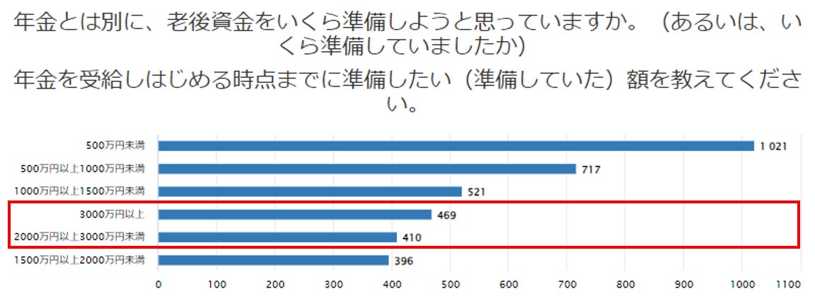 ・老後資金の準備額(準備しようと思っている額)は「500万円未満」が最も多い。「2000万以上」と回答した人は、全体の約25%(選択回答形式)
