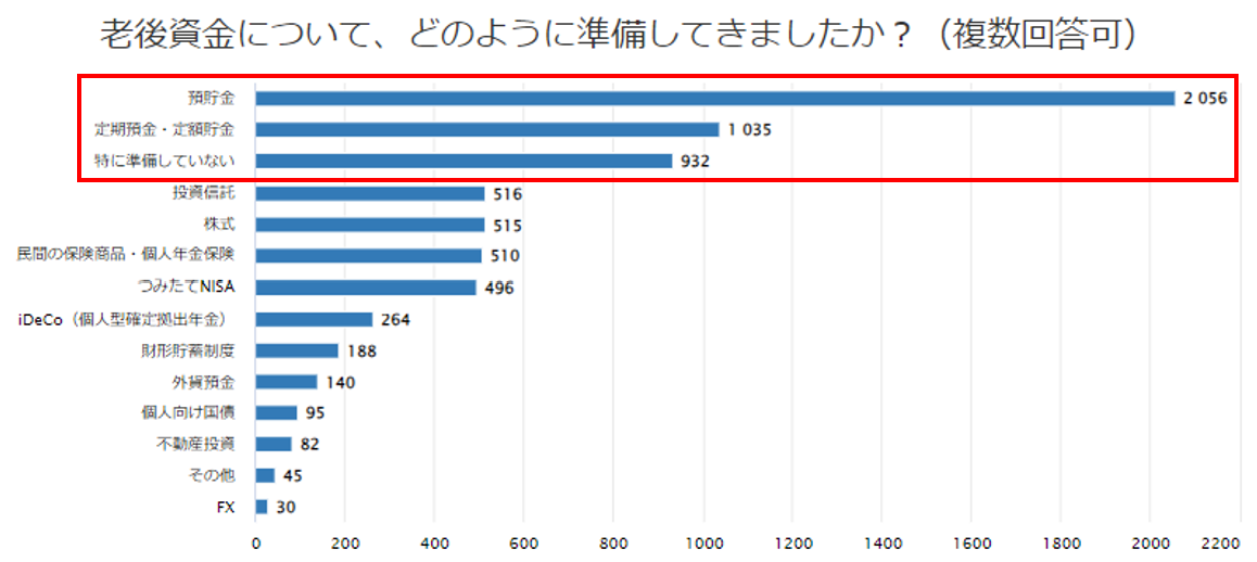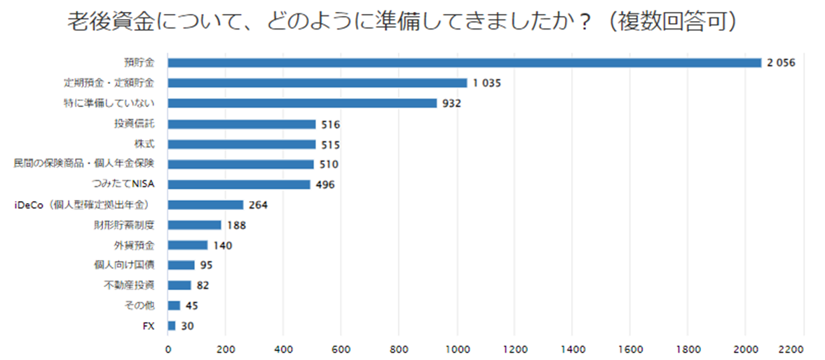 ・老後資金の準備方法は「預貯金」「定期預金」と回答する人が多い一方で、「特に準備していない」と回答する人も多い結果となった(複数選択回答形式)