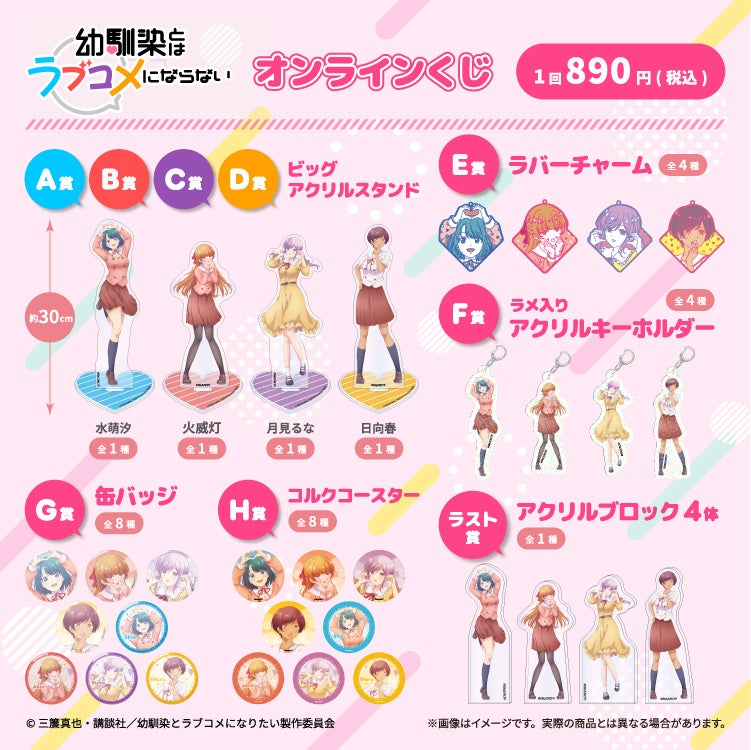 TVアニメ『幼馴染とはラブコメにならない』 から汐・灯・るな・春の4人が、オンラインくじになって登場!ファミマオンライン限定のグッズをぜひお楽しみください。