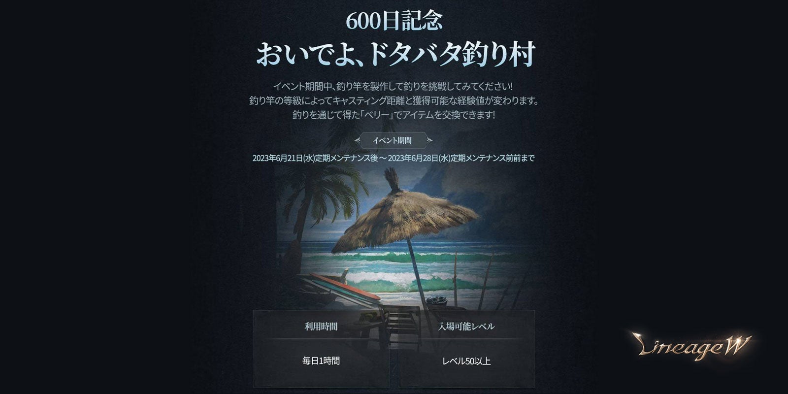600日を記念して、期間中、イベント ダンジョン「おいでよ、ドタバタ釣り村」が登場します。