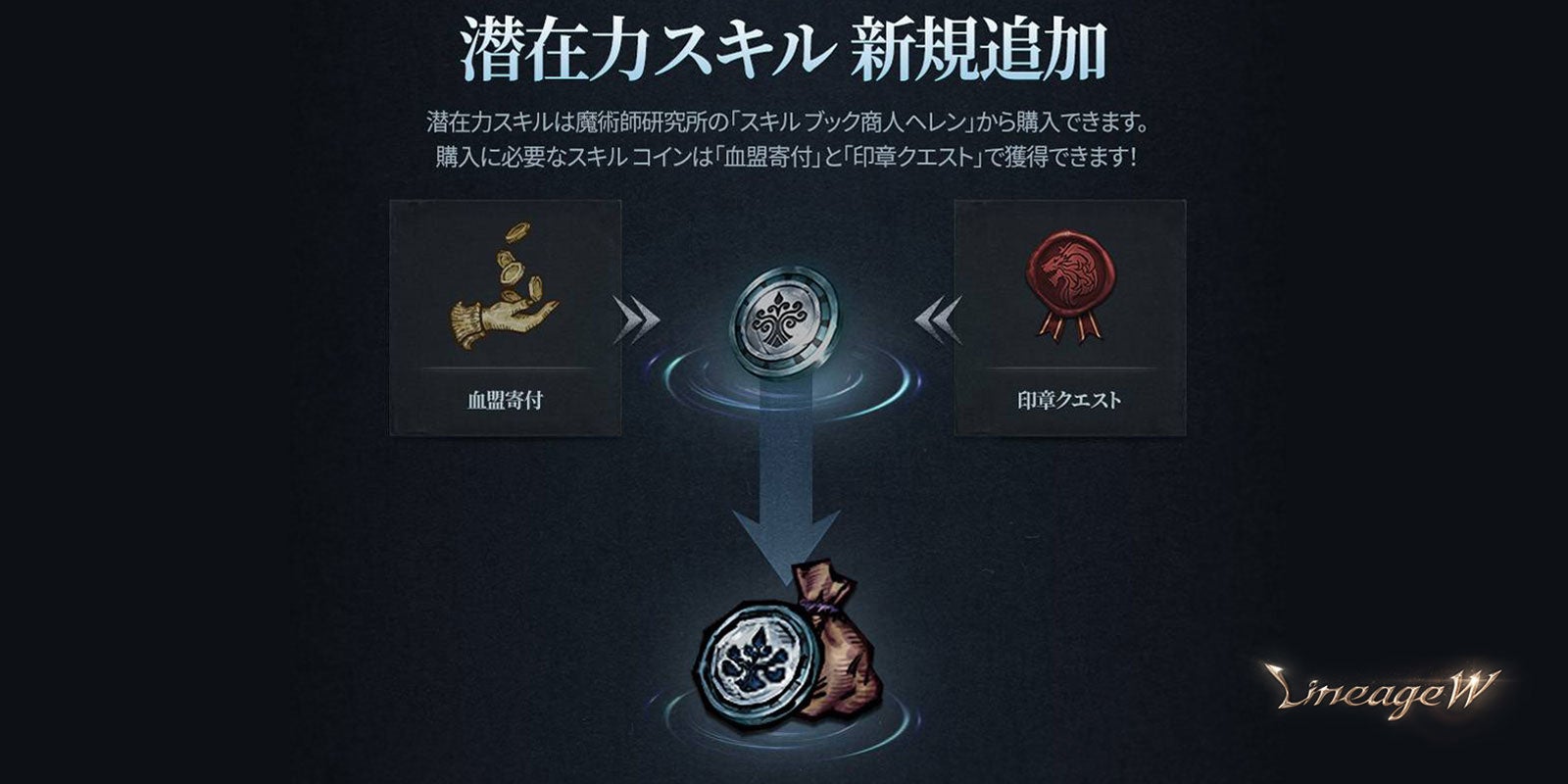 「潜在力スキル」はグルーディオ領地の魔術師研究所にいる「スキル ブック商人 ヘレン」から「スキル コイン」を引き換えに獲得することができます。「スキル コイン」は血盟寄付や印章クエストで獲得することが可能です。