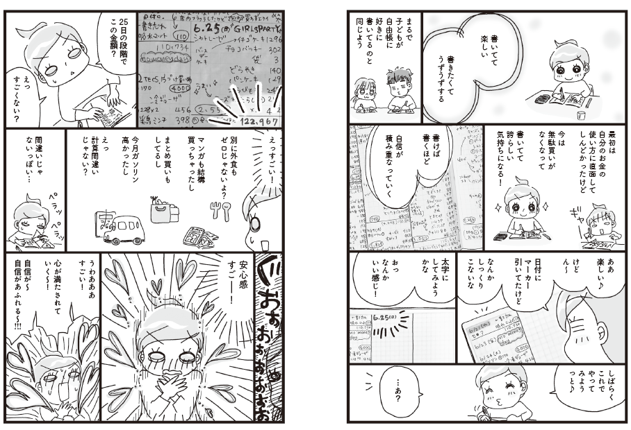 シンプルな方法ながら続けていくうちに「自分が何にいくらお金を使っているのか」、「これは本当に今、必要なものか」を実感し、お金を使う取捨選択や、タイミングをコントロールできるようになることで、結果、家計は改善。お金を的確に使えるようになるのです。