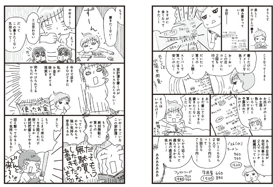 それまで目を背けてきた家計に向き合うことは、しんどいこと。「1日に2回もコンビニに行っている」「夫とのテレワークランチの回数が多すぎる(しかも満足度も低い)」「安いからと多めに買いすぎ」。うださんも、一カ月めは家計簿を書くたびにダメージを負っていました。結果も大赤字。