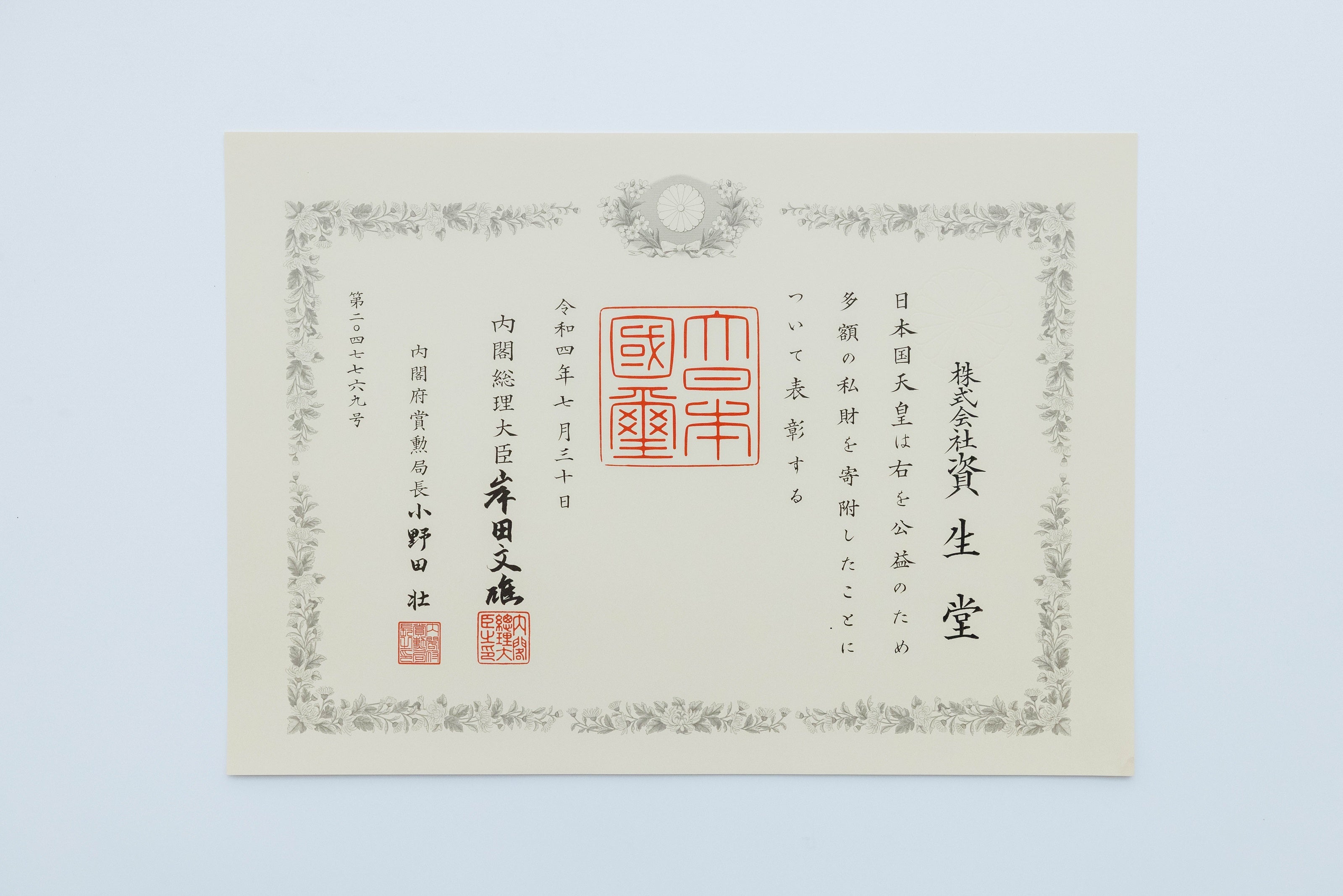 資生堂は、公益財団法人日本ユニセフ協会(以下、日本ユニセフ協会)への支援活動に対し、紺綬褒章に係る褒状を受章しました。この活動は、資生堂のグローバルラグジュアリーブランド 「クレ・ド・ポー ボーテ」による日本ユニセフ協会への寄付を通じて、世界中の少女たちへの教育およびエンパワーメントの活動支援に対する功績が認められたものです。