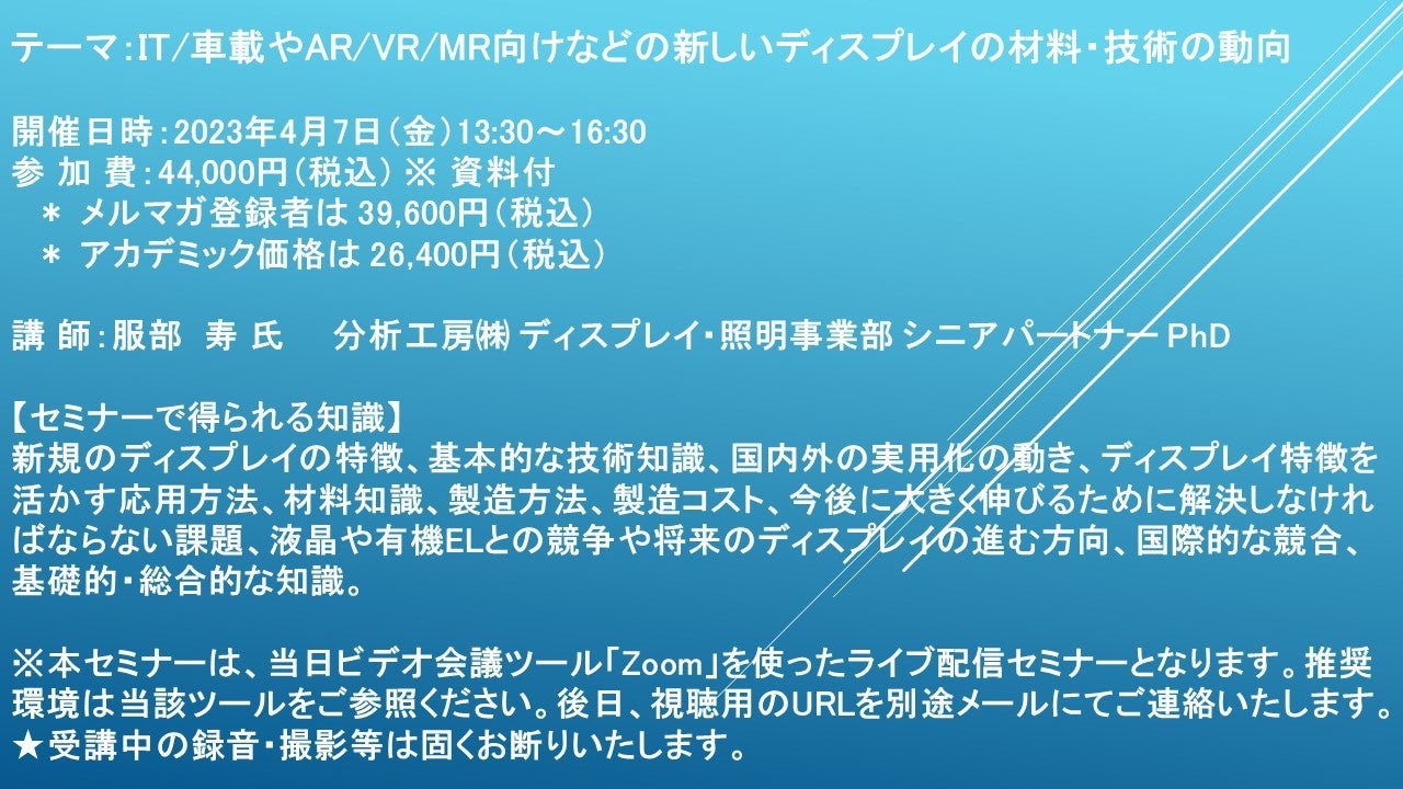 先端技術情報や市場情報を提供している(株)シーエムシー・リサーチ(千代田区神田錦町: https://cmcre.com/ )では、 各種材料・化学品などの市場動向・技術動向のセミナーや書籍発行を行っておりますが、 このたび「IT/車載やAR/VR/MR向けなどの新しいディスプレイの材料・技術の動向」と題するセミナーを、 講師に服部 寿 氏 (分析工房(株) ディスプレイ・照明事業部 シニアパートナー PhD)をお迎えし、2023年4月7日(金)13:30より、 ZOOMを利用したライブ配信で開催いたします。 受講料は、 一般:44,000円(税込)、 弊社メルマガ会員:39,600円(税込)、 アカデミック価格は26,400円(税込)となっております(資料付)。