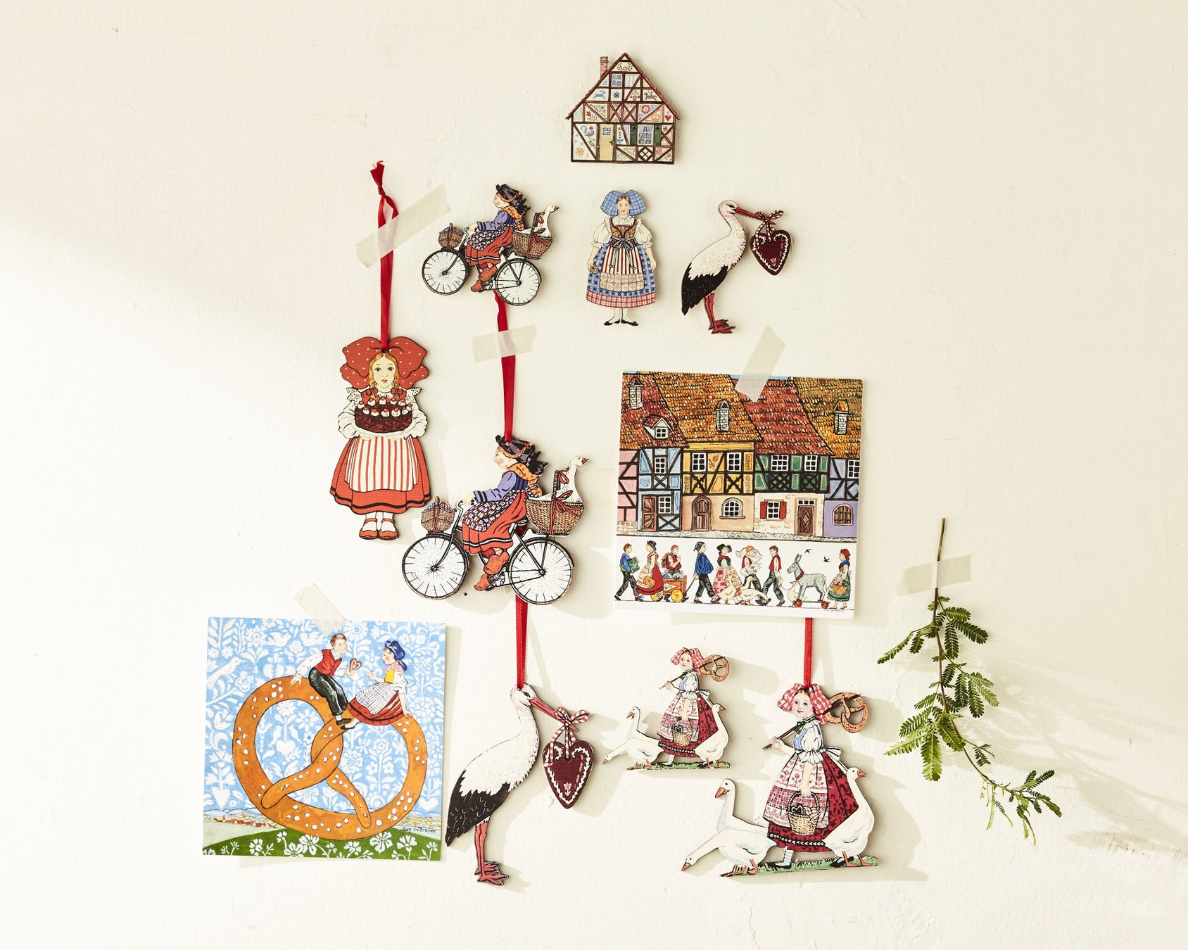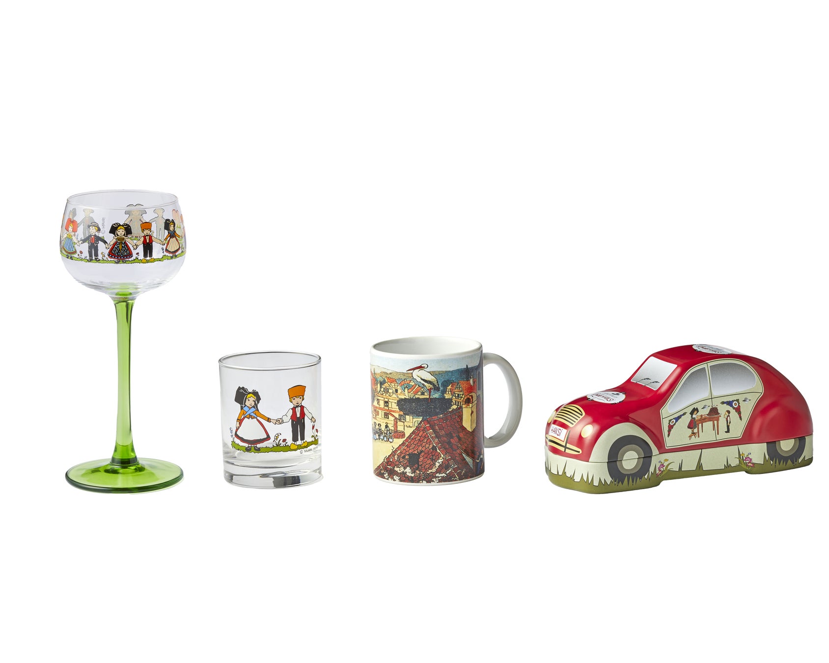 アルザスの民族衣装の少女を描いた「ハンジ」の可愛い雑貨や900年以上受け継がれる伝統工芸のスフレンハイム陶器など、手仕事のぬくもりを感じる懐かしくて素敵なものを豊富に。また美しい街や民族衣装、アルザシアンの暮らしを描くギィ・ウンテライネールがデザインした「ポワラーヌ」のビスケット缶や1806年創業の老舗「リップス」のパン・デピスも登場します。