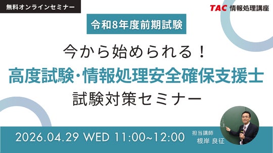 情報処理技術者試験対策講座を展開しているTAC株式会社(東京都千代田区)は、2026年前期合格目標の無料オンラインセミナーを4/29(水)に開催します。