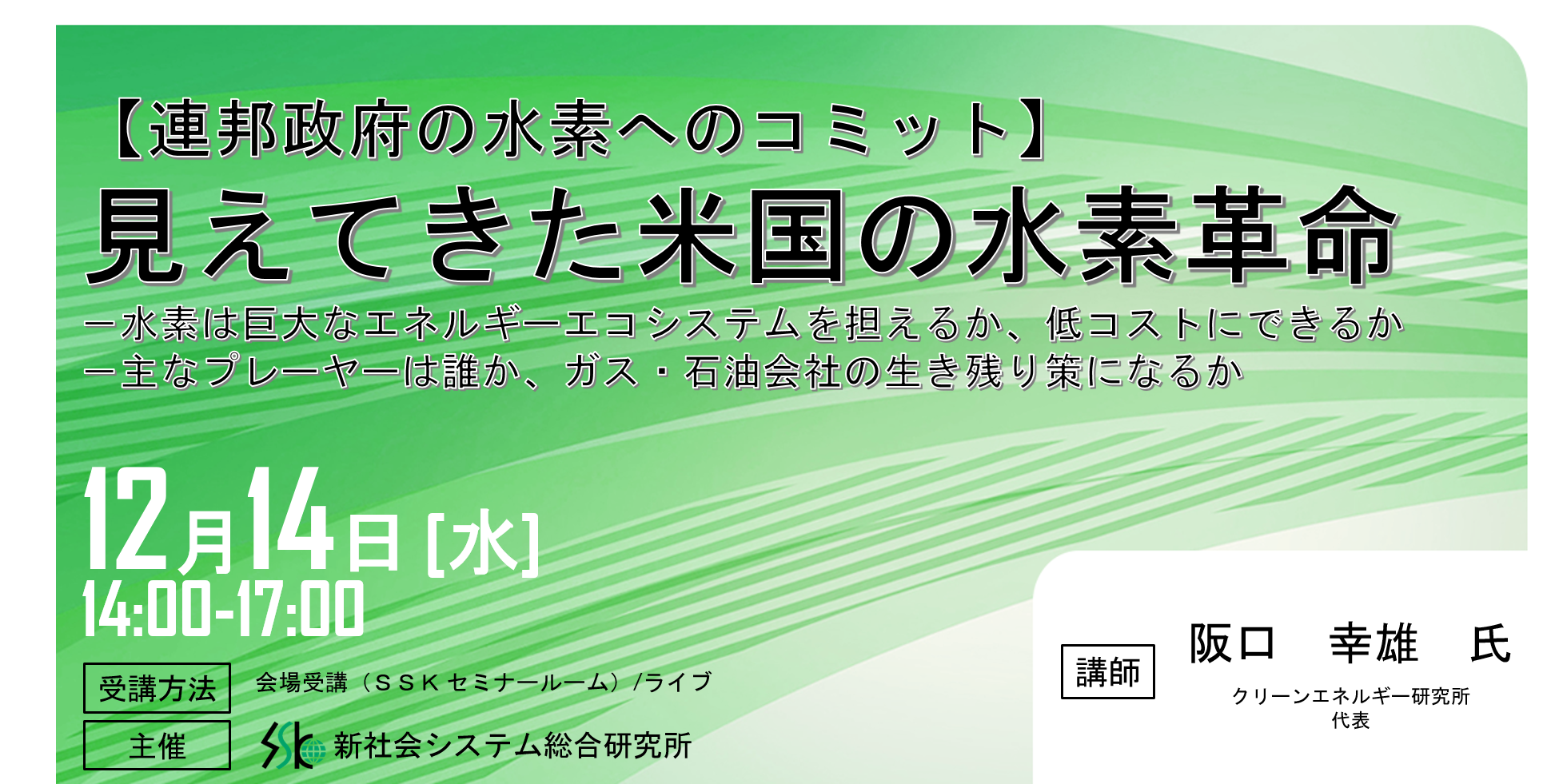 「見えてきた米国の水素革命」と題してクリーンエネルギー研究所 代表 阪口 幸雄氏のセミナーを2022年12月14日(水)に開催!!