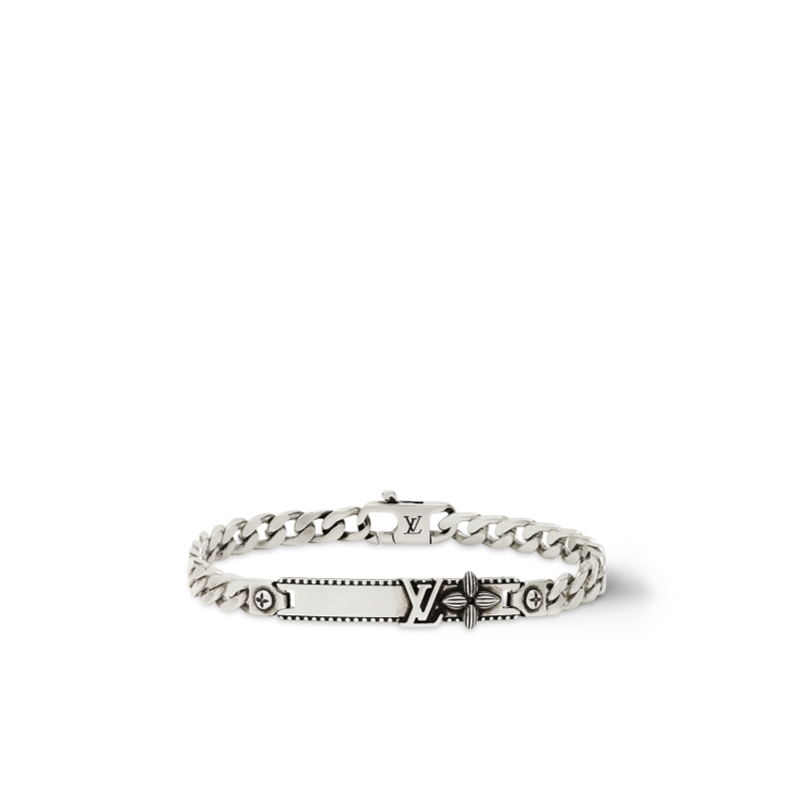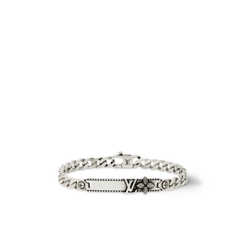 編み込み風のリンクと刻印入りのクラスプを配し、LV イニシャルとモノグラム·フラワーのスタッズで仕上げました。単体でも魅力を放ち、他のブレスレットとの重ね着けでもスタイリッシュな印象を演出する、使いやすいアイテムです。