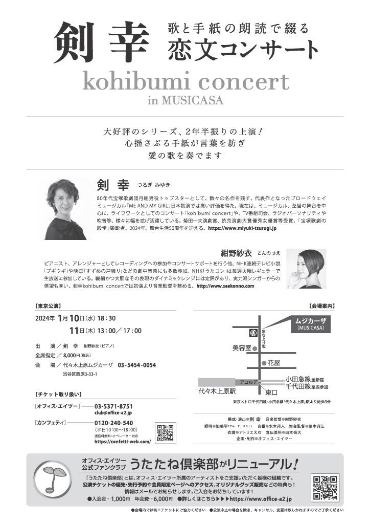 2024年に舞台生活50年を迎える剣幸が贈る、歌と朗読のコラボレーション。熱い想いのこもった手紙の朗読と、その内容にイメージされる曲をカップリングしてお届けする好評のシリーズ、久しぶりの上演です。代々木上原のムジカーザは音の響きも素晴らしく、紺野紗衣が奏でるピアノの音色は絶品! 瀟洒なサロンで味わう、涙と笑いにつつまれる贅沢なひととき。あたたかい空気に溢れた剣幸恋文コンサートをぜひ体感してください!