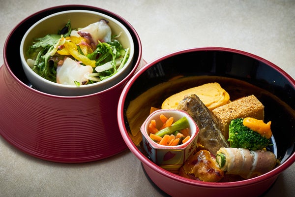 八寸では、いわき市の「市の魚」にも認定されている、皮が薄くふんわりとした柔らかい食感の“メヒカリ”を、骨ごと召し上がっていただけるように唐揚げにしてご用意いたします。サラダでは、濃厚な旨みと肉厚な身の“ヤナギダコ”を、春らしく桜風味のドレッシンに合わせました。焼物では、塩麹に漬けてより柔らかく旨みが引き出された会津地鶏と、みずみずしい中にコクのある福島県産のかぶをお楽しみいただけます。福島県産のあおさを練り込んだ厚揚げの煮物や、バター醤油で焼いた阿武隈川メイプルサーモンの身をほぐしたご飯、福島県産の苺ゼリーなど、ランチでも魅力溢れる食材をしっかりと感じていただる御膳になっています。
