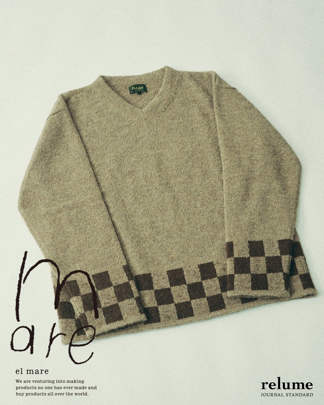 最高級アルパカを贅沢に使用したrelume別注Vネックニット。ルーズなシルエットと裾/袖のチェッカー柄が、リラックス感とカジュアルさを両立。軽さと温かさが特徴です。/\33000+tax