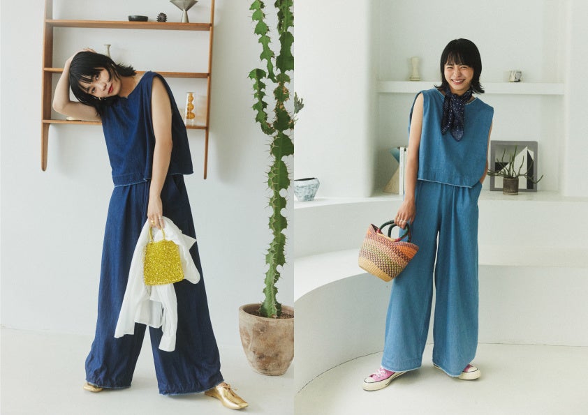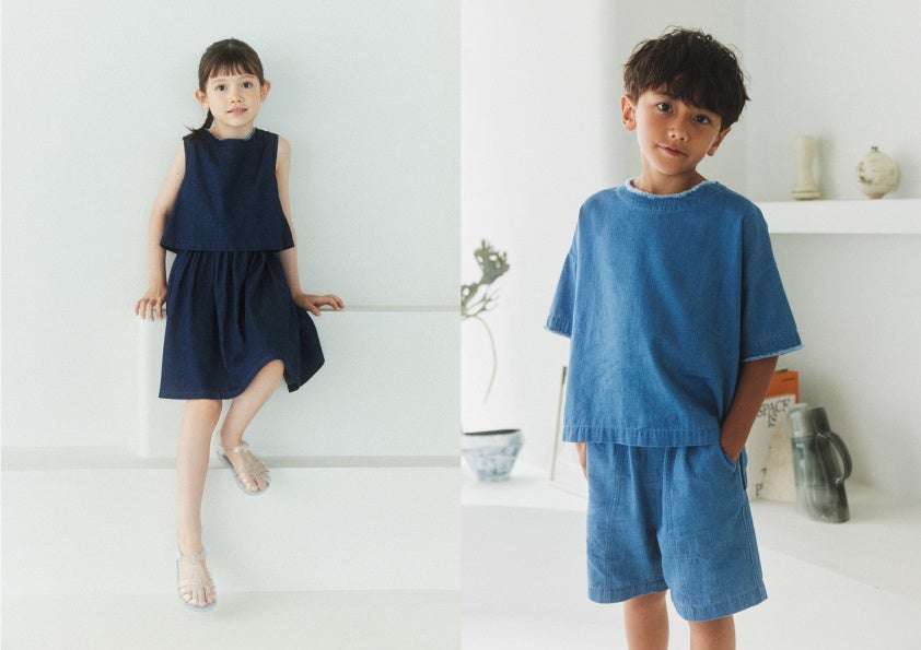 海外のファッションカルチャーが好きな安保さんは、シンプルながら素材に表面変化があるキャミワンピースをプロデュース。パット付きのワンピースは下着を着用する必要がなく、汗ばむ季節にも快適に着られる仕様です。また、カジュアルなファッションを好む忍舞さんはデニム素材のオールインワンを制作しました。パンツの裾を絞ることで2通りのスタイルを楽しむこと可能なアイテムです。さらに、1児のママである忍舞さんは、親子でもお揃いで着られるよう、キッズでは同素材のセットアップとワンピースも展開します。