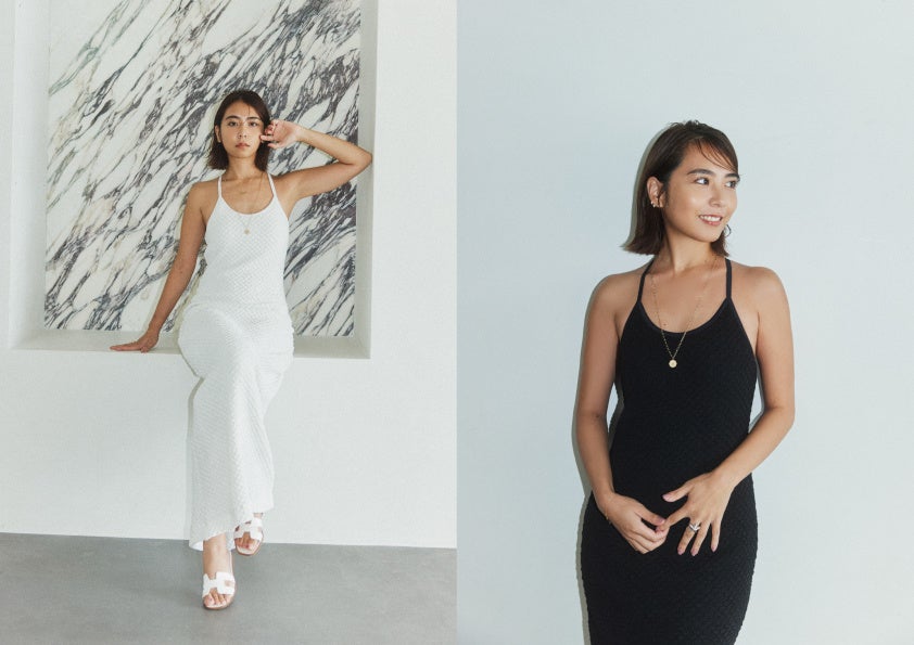 私自身、海外が好きなので、海外っぽさもありつつ日本でも着ることができるワンピースをテーマに作りました。表面変化のあるポコポコとしたパット付きワンピース。よく伸びる素材なのでストレスフリーに着られます。このワンピースを着ることで“今日の自分”に自信が持てたらいいなと思います。いろんな場所に連れて行きたくなる1着です。