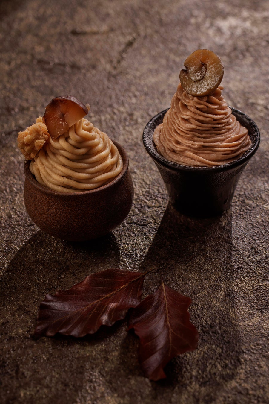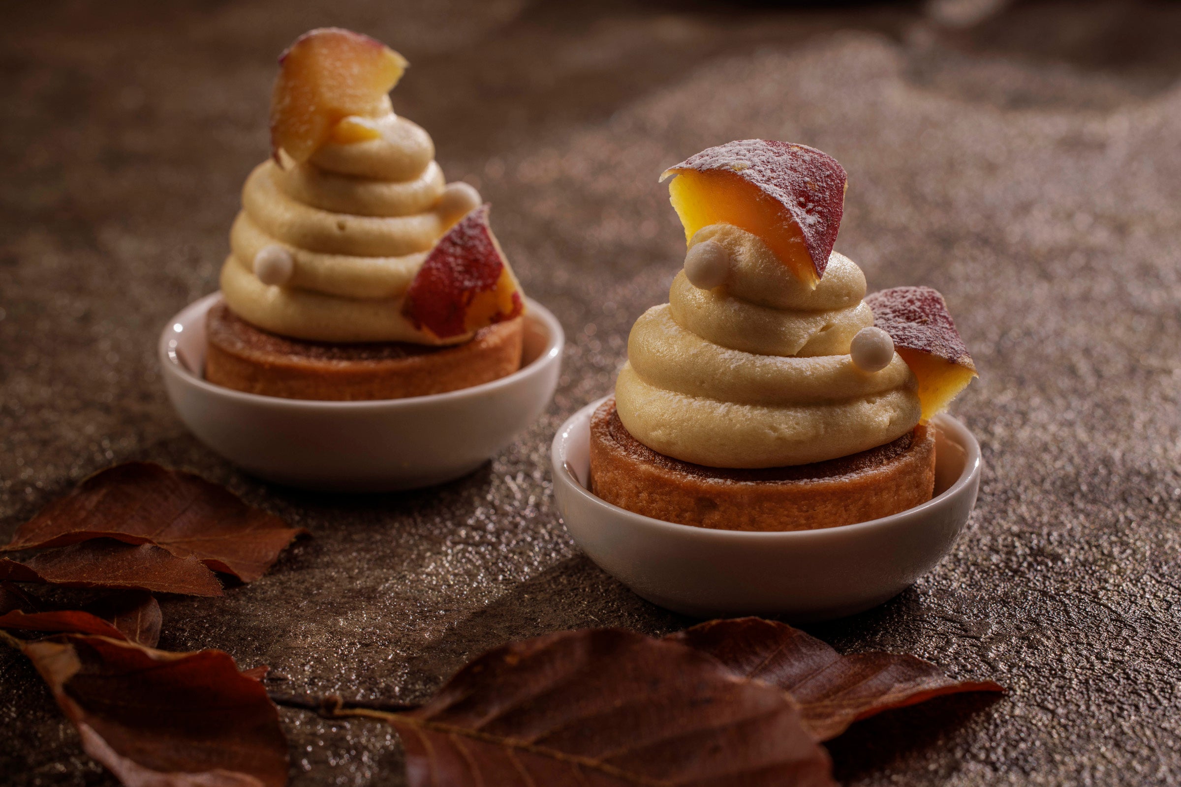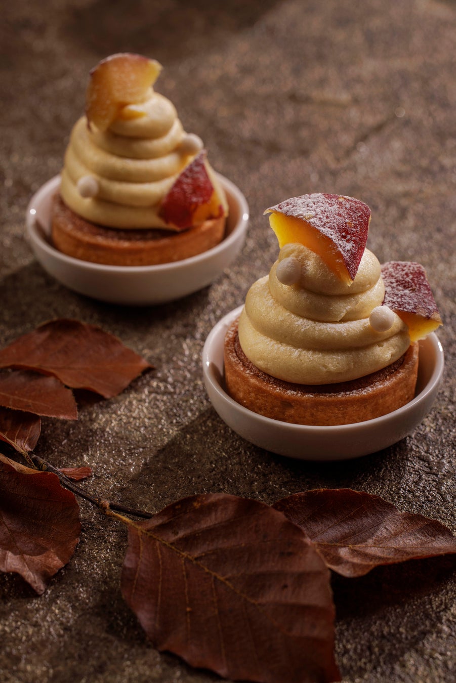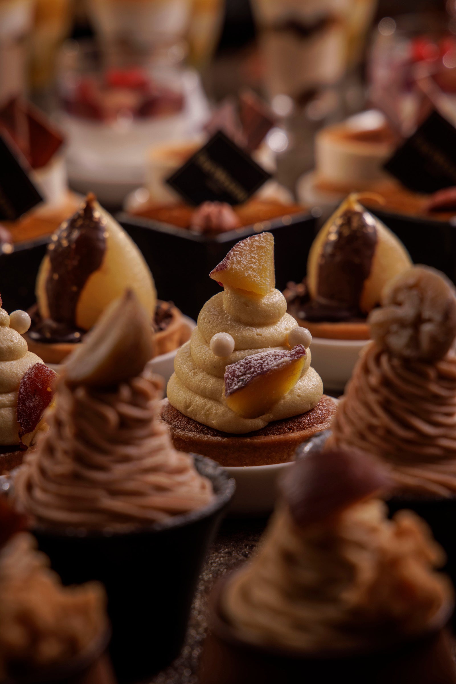 栗、ぶどう、洋なし、りんご、無花果、かぼちゃ、さつまいも、木の実──。秋を象徴する多彩な食材を、ペストリーシェフ率いる熟練のチームが繊細かつ創造的なデザートの数々へと昇華させました。 一つひとつ丁寧にこだわって作り上げた20種類以上ものデザートが、秋のひとときを贅沢に彩ります。