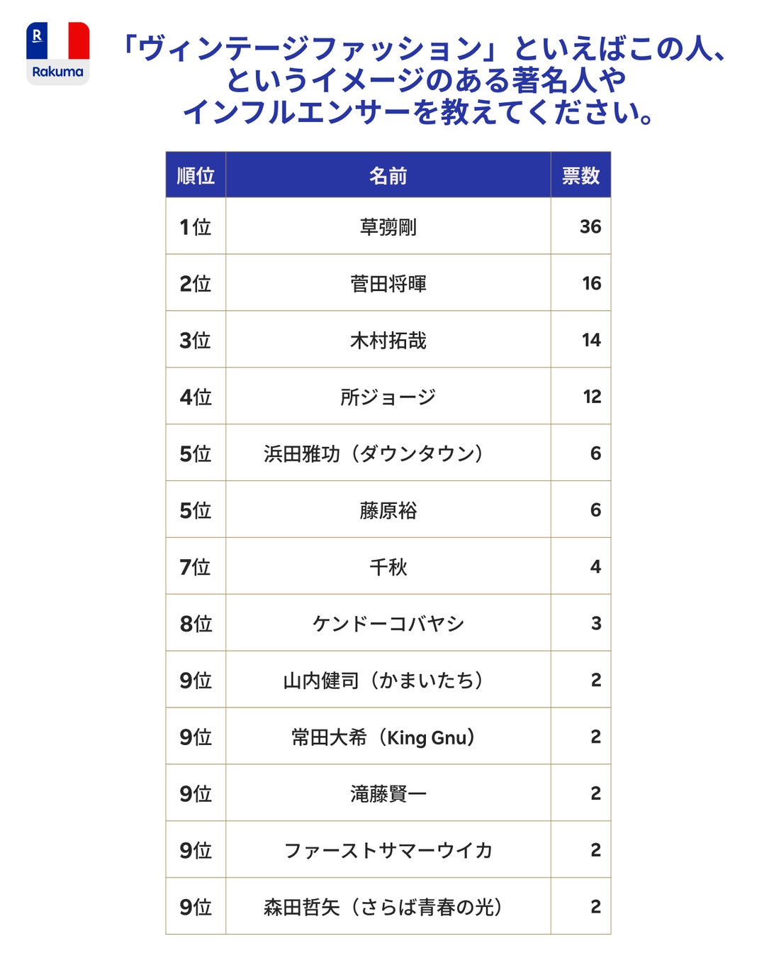 ●「ヴィンテージファッションといえばこの人」、1位が草彅 剛さん、2位に菅田 将暉さん、3位に木村 拓哉さん