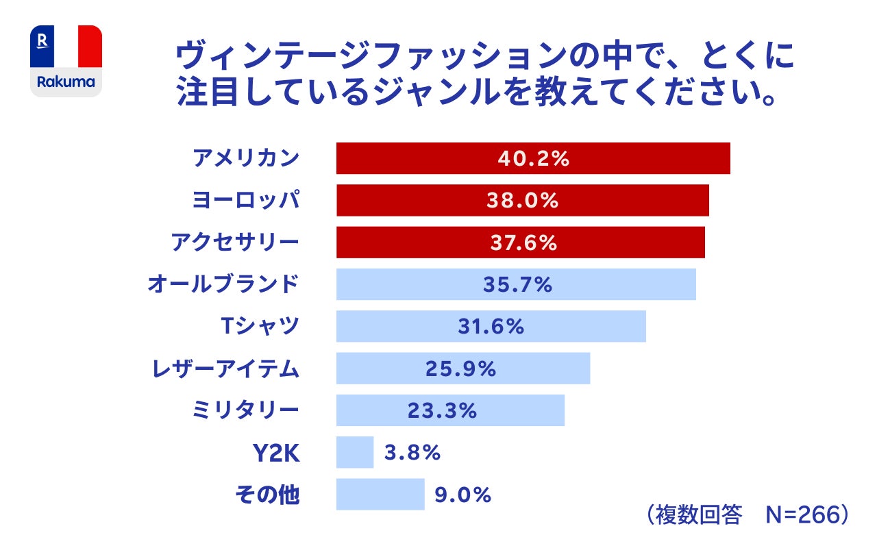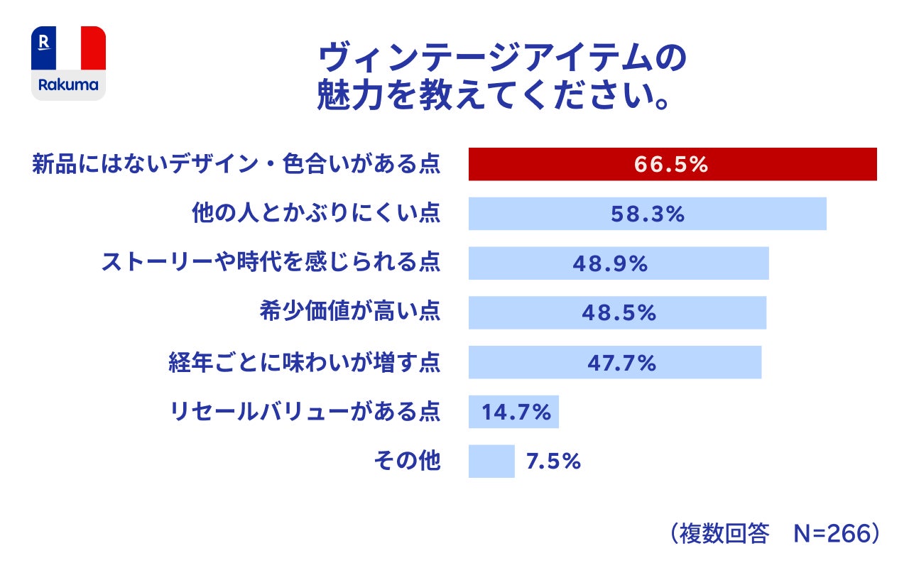 「楽天ラクマ」では、事業者が出店する「ラクマ公式ショップ」におけるヴィンテージアイテムの取引金額が昨年同期比で122%の規模に成長しています(注1)。今回は、「ヴィンテージアイテムを購入したことがある」ユーザー266名を対象に意識調査を実施しました(注2)。