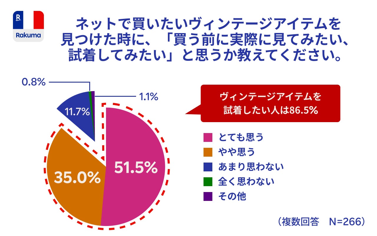 ヴィンテージアイテムを購入する販路として「フリマアプリ」と答えた人が最も多い中、インターネットで見つけたヴィンテージアイテムを「買う前に実際に見てみたい、試着してみたい」と思う人は、「とても思う」(51.5%)、「やや思う」(35.0%)を合わせて8割以上の結果となりました。ECを通じた購入が一般化している一方、購入においては試着の需要が高いことがわかりました。