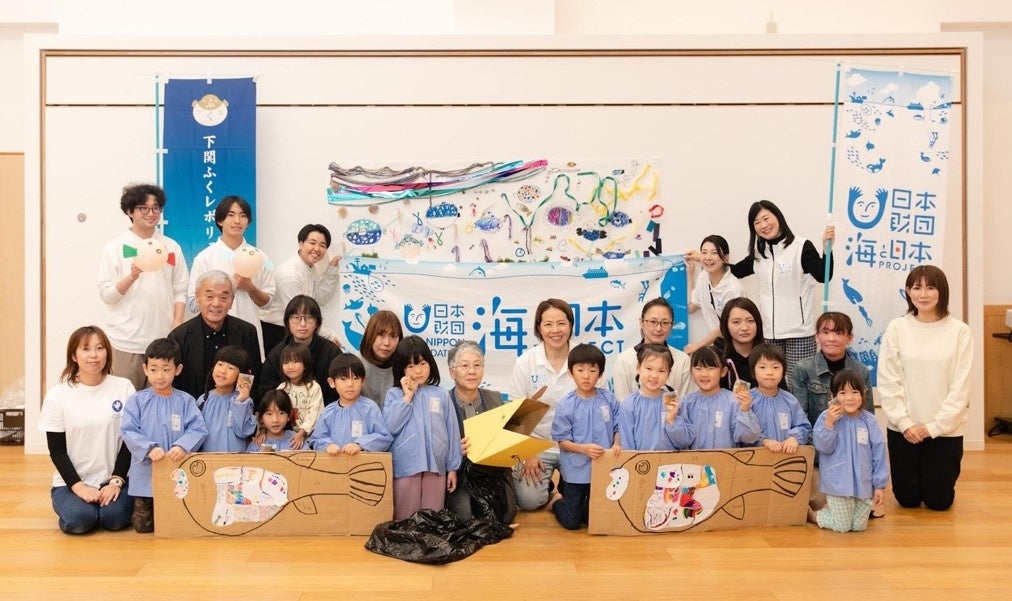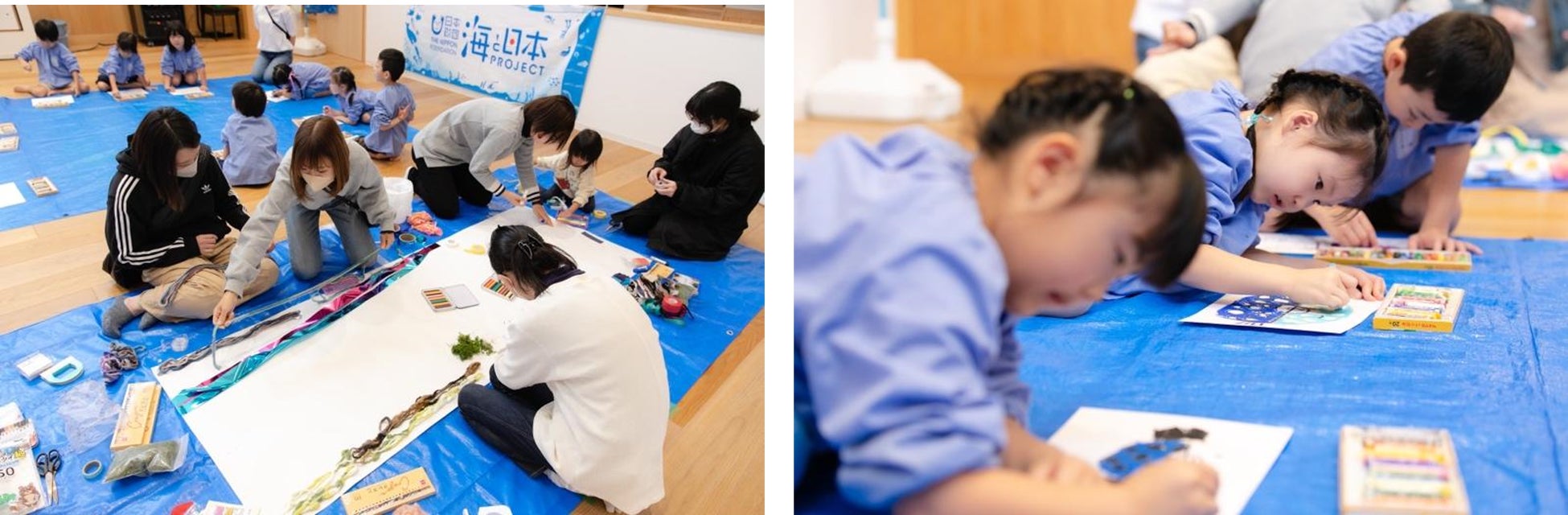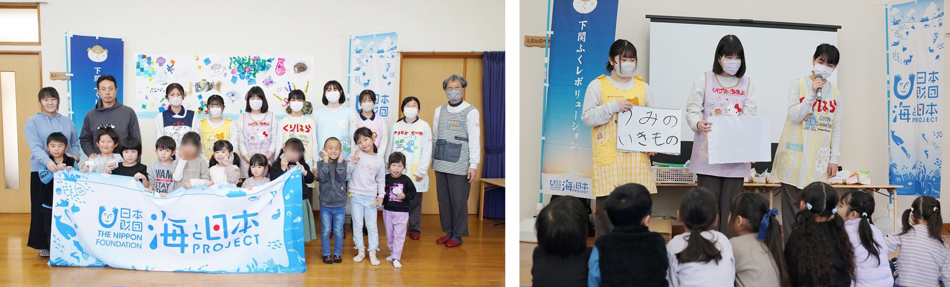 下関短期大学付属第二幼稚園は周囲をぐるっと海に囲まれた下関市彦島に位置し、目の前が美しい海というまさに海の授業に最適の環境。園児のみなさんは、事前に「海の工作」をたくさん作り講堂に展示。保護者向けの発表会も行われ、この日のイベントを迎えてくださいました。