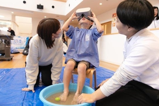 ダイバーとしてギネス記録をもち、水中生物とコミュニケーションを取りながら世界の海で水族表現家として活動する二木あい氏が魚と一緒に泳ぐシーンが、ゴーグルを通して前後左右360°VRの映像で子どもたちの目の前に広がりました。ぐんぐんとその海の世界に引き込まれていく子どもたち。「ふくの教室」で学んだフグもたくさん泳いでいました。海水に浸けた足をバタバタと動かし、初めは怖がっていた子も夢中になって海感を楽しみました。
