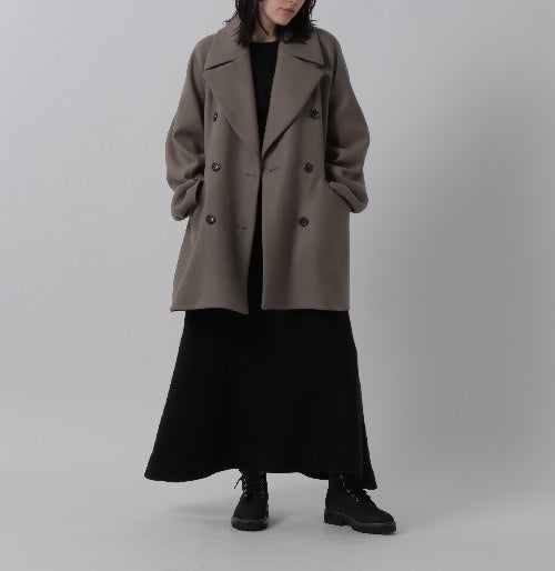 袖がラグランのような仕様になっているため、どの様な方の肩にもフィットしやすくなじむデザイン。裾に向かってきれいに出るドレープが特徴です。様々なアイテムと合わせやすい、シンプルで美しいコート。