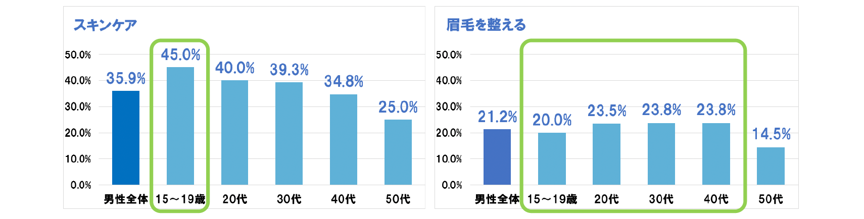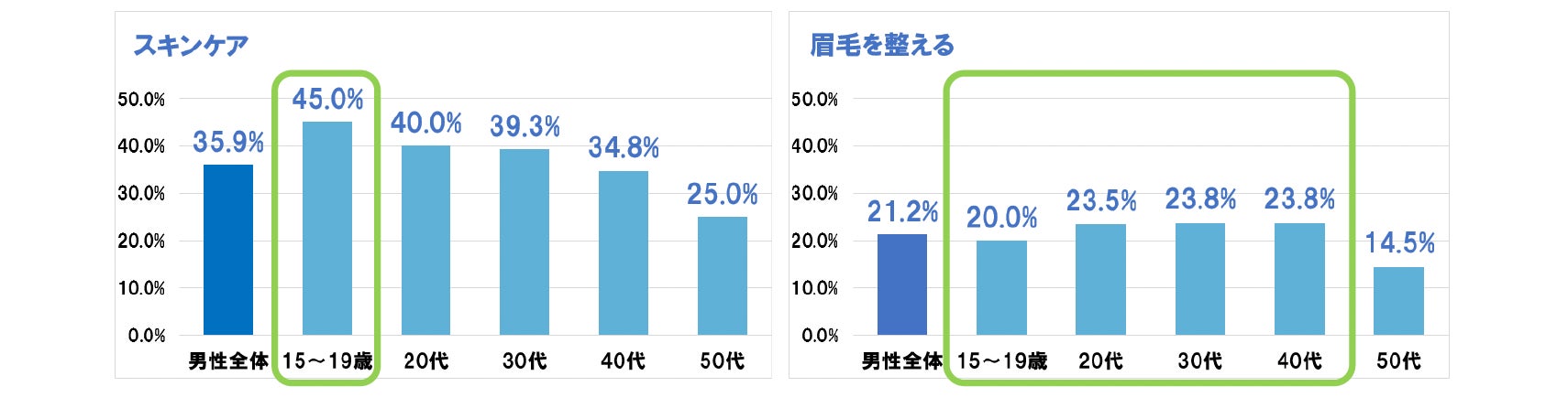 「スキンケア」の実施率は、15~19歳が最も高く45.0%。「眉毛を整える」は、40代まで2割以上が実施。