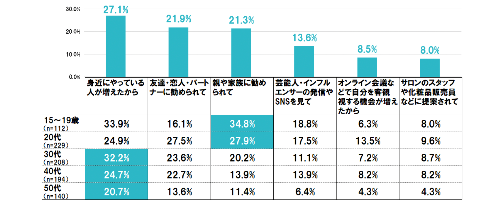 日焼け止めを塗る高校球児が話題になりましたが、10代後半男性のスキンケアは45.0%と日常的なものになっています。また、15~29歳男性は化粧品を女性の家族とシェアすることにあまり抵抗感はなく、7割以上が「全く気にならない」「あまり気にならない」と回答しました。美容ケアを始めるきっかけも「親や家族に勧められて」が最も高いです。親が子供に日焼け止めを塗るケースも多く、家庭の中でスキンケアをごく当たり前に取り入れる男性が増えていると考えます。