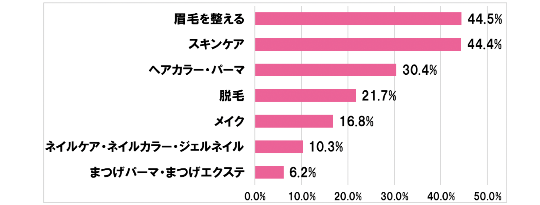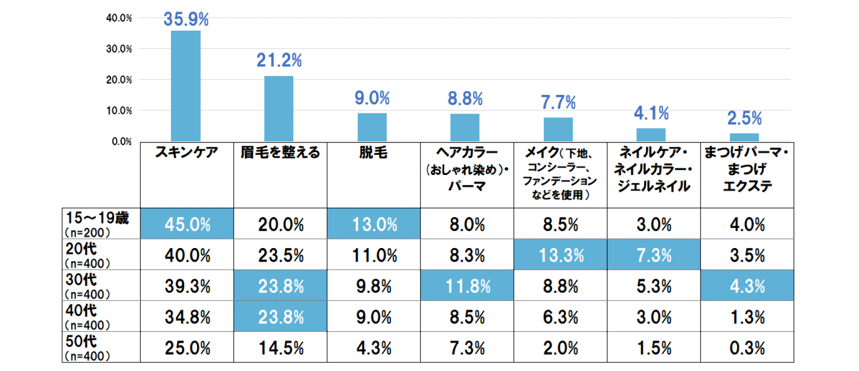 全年代で最も実施率が高いのは、「スキンケア」。次いで「眉毛を整える」。「スキンケア」と「脱毛」は15~19歳が最も高く、「メイク」「ネイルケア・ネイルカラー・ジェルネイル」は20代が最も高い。「眉毛を整える」は30代と40代が最も高く、「ヘアカラー・パーマ」、「まつげパーマ・まつげエクステ」は30代が最も高い。