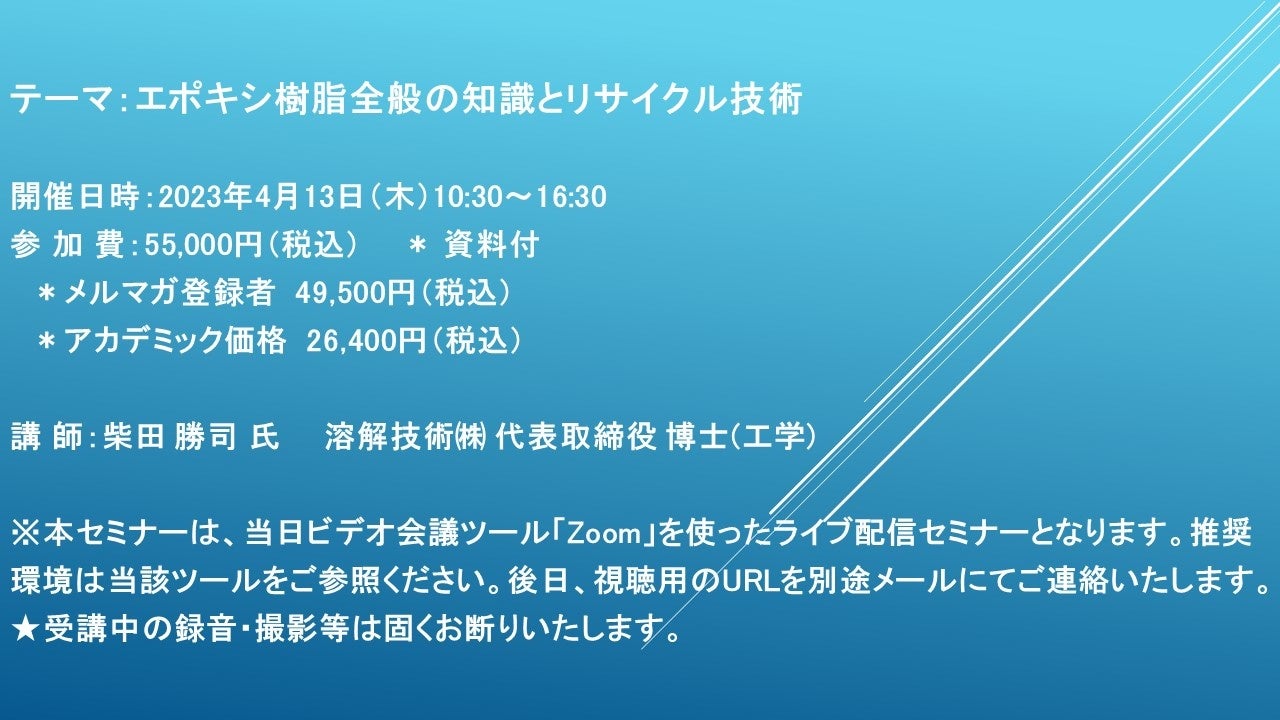 先端技術情報や市場情報を提供している(株)シーエムシー・リサーチ(千代田区神田錦町: https://cmcre.com/ )では、 各種材料・化学品などの市場動向・技術動向のセミナーや書籍発行を行っておりますが、 このたび「エポキシ樹脂全般の知識とリサイクル技術」と題するセミナーを、 講師に柴田 勝司 氏 (溶解技術(株) 代表取締役 博士(工学))をお迎えし、2023年4月13日(木)10:30より、 ZOOMを利用したライブ配信で開催いたします。 受講料は、 一般:55,000円(税込)、 弊社メルマガ会員:49,500円(税込)、 アカデミック価格は26,400円(税込)となっております(資料付)。