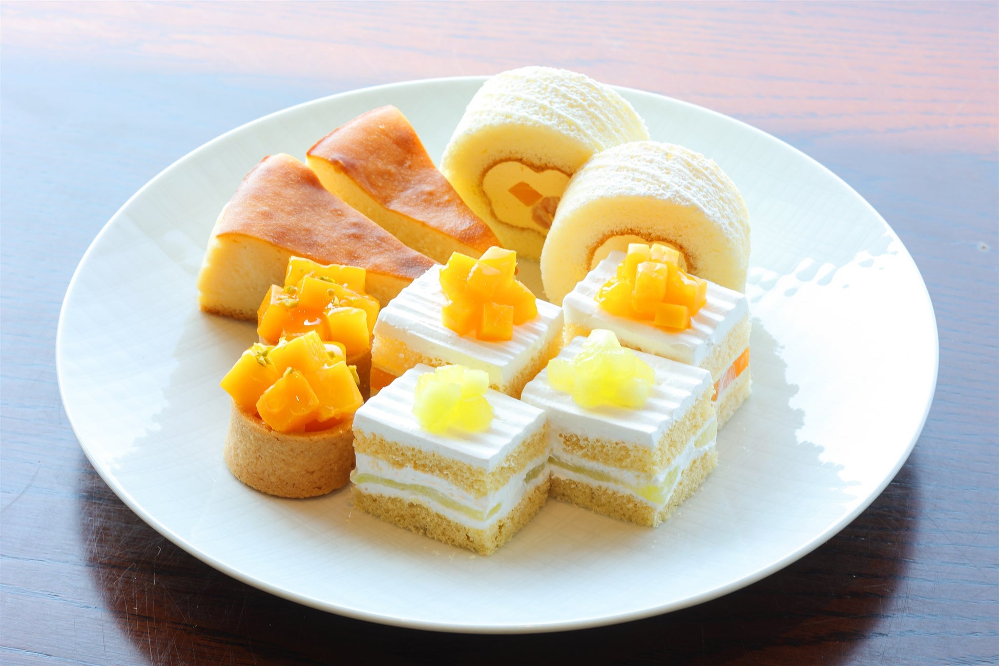 中段には、完熟マンゴーをふんだんにあしらった「マンゴーショートケーキ」、糖度14度以上の極上マスクメロンを使用したメディアでも話題の「スーパーメロンショートケーキ」にふんわりとしたロール生地にマンゴーを包み込んだ「マンゴーロール」に「マンゴータルト」、女性に人気の「豆乳バスクチーズケーキ」をご用意。