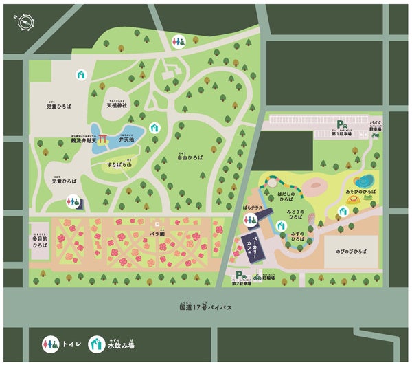 施設概要(南園):ベーカリーカフェ、ばらテラス(展望デッキ・トイレ)、インクルーシブ遊具 他