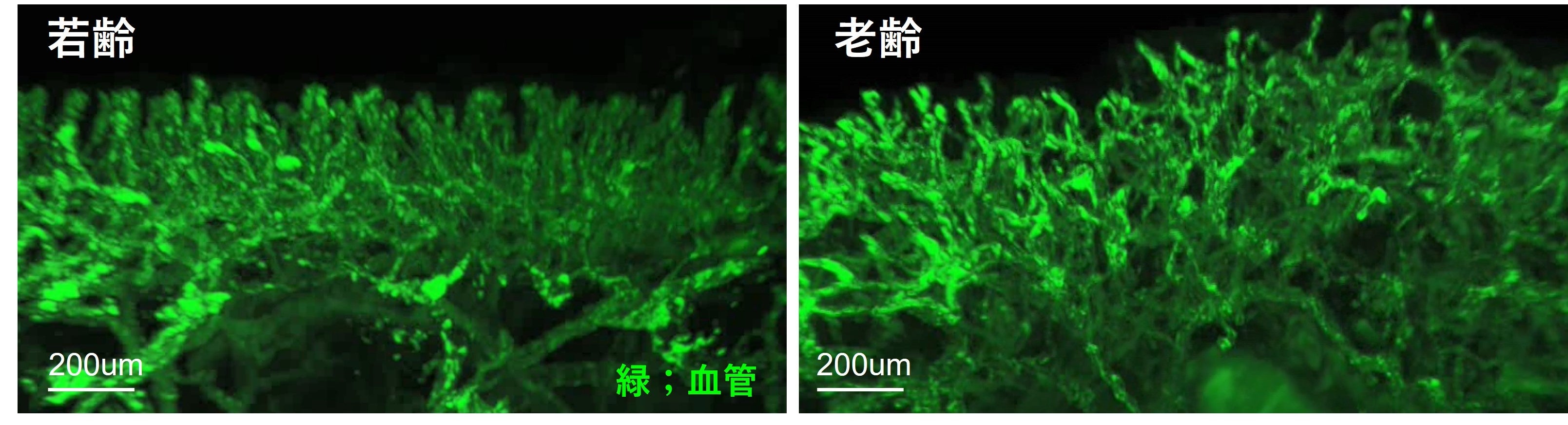 つまり、通常の皮膚では表皮から放出されるネトリン-1が毛細血管ループの頂上に発現しているUNC5Bに作用し、反発することで毛細血管が表皮に侵入しないように働いており、適切な距離を保つことができると考えられます。しかしながら、老化した皮膚ではネトリン-1が異常に産生されることで、毛細血管が表皮から必要以上に遠ざかってしまい、毛細血管から表皮へペリサイトを受け渡す能力が低下した結果、表皮幹細胞が減少すると考えられました。