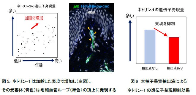 さらに当社は、ネトリン-1を抑制する成分を探索したところ、本柚子果実抽出液にネトリン-1の発現抑制効果を見出しました(図6)。本柚子果実抽出液によって、ネトリン-1の過剰な発現が適切に抑制され、毛細血管と表皮の距離が維持されることにより、毛細血管からの表皮幹細胞の受け渡しが正常化することが期待されます。