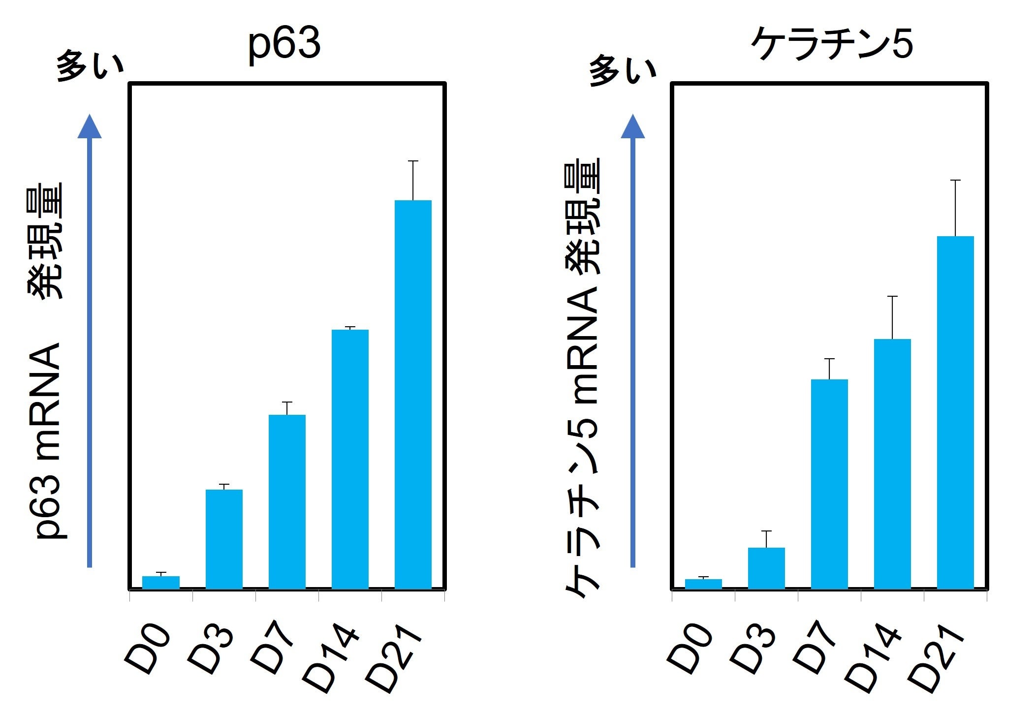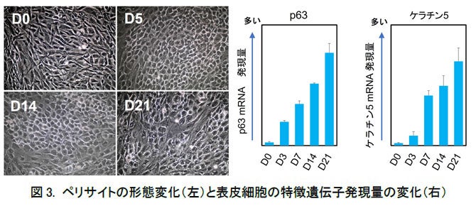 当社は、皮膚などの組織を透明化し、特定の構造を3次元的に可視化する独自の技術を用いて、皮膚の毛細血管網と表皮幹細胞の位置関係を観察しました。その結果、表皮直下に特徴的に存在する毛細血管のループ構造の最上部付近には、表皮幹細胞がキャップを被せるように存在していることを発見しました。さらに単一の毛細血管ループについて、血管・表皮幹細胞・基底膜を染色し詳細な観察を行ったところ、毛細血管に接着するペリサイトと表皮幹細胞の両方に架橋するように存在する細胞を発見しました(図1;黄矢印)。この現象から、真皮側の毛細血管ループに接着しているペリサイトが剥離し、表皮幹細胞として表皮側に供給されている可能性が考えられました。この現象におけるペリサイトの機能を検証するため、ペリサイトに特異的に発現する細胞表面蛋白質を指標として、FACS(Fluorescence-Activated Cell Sorting)技術※3 により、皮膚からペリサイトのみを単離して、表皮細胞を培養する条件下で培養したところ、表皮細胞に特徴的なp63やケラチン5の遺伝子発現がペリサイトで上昇し、ペリサイトが表皮細胞様に分化することを見出しました(図3)。これらの結果から、真皮の毛細血管ループから供給されたペリサイトが表皮幹細胞として機能し、表皮細胞の維持に寄与している可能性を世界で初めて発見しました。