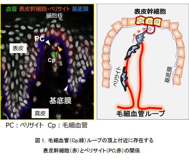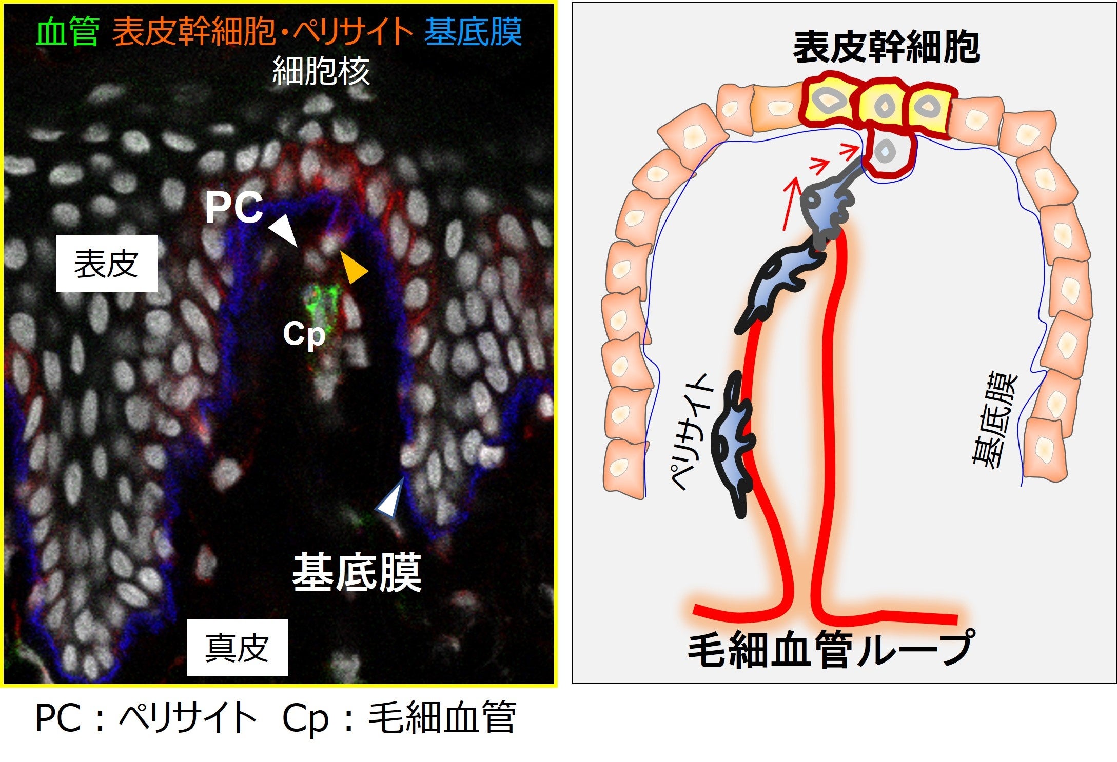 当社はこれまで20年以上にわたり、皮膚の毛細血管が真皮の恒常性を維持する分子メカニズムについて研究し、健康な毛細血管が肌のシワ、たるみの抑制や肌の弾力維持に寄与する可能性を見出してきました。毛細血管は真皮に存在するため、これまでは肌表面の美しさを担う表皮に対して毛細血管の関与は少ないと考えられてきました。しかし、毛細血管と表皮細胞の位置関係を詳細に観察した結果、表皮側に伸びるように存在している真皮の毛細血管のループ構造が予想以上に表皮の近傍に存在しており(図1)、毛細血管が間接的に表皮の恒常性までもコントロールしている可能性が考えられました。血管には全身の各臓器において幹細胞の居場所(ニッチ)を形成し、組織再生を促す機能が知られていることから、今回我々は真皮の毛細血管には表皮幹細胞を維持する機能があるという仮説をたて、当社独自で最先端の可視化技術および分子生物学的アプローチから検証を行いました。