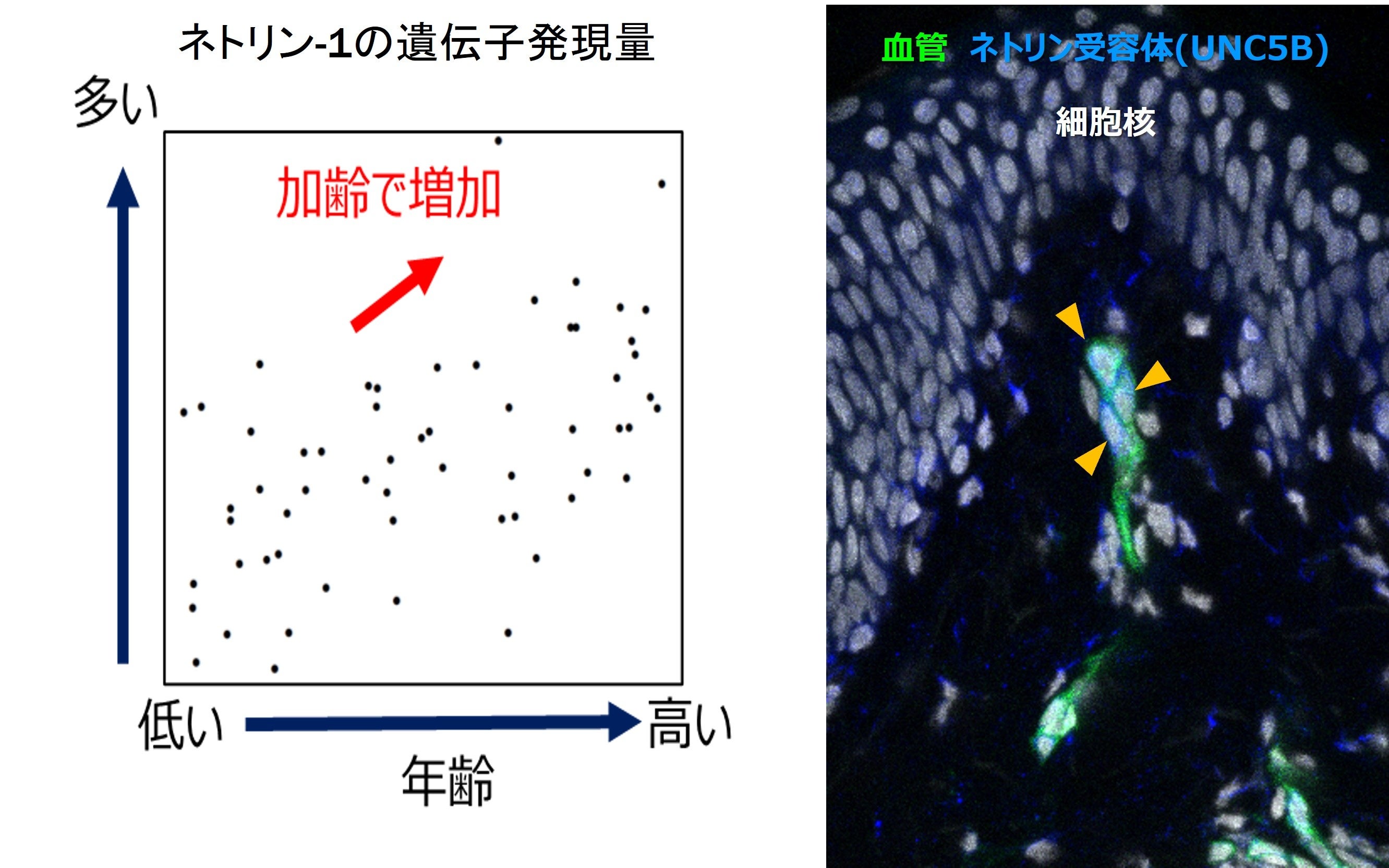 ※2 神経軸索の誘引や反発、神経に関連する細胞の遊走(移動)を制御するたんぱく質として知られているが、皮膚において表皮と毛細血管の距離の調節にネトリン-1が作用することは知られていなかった。