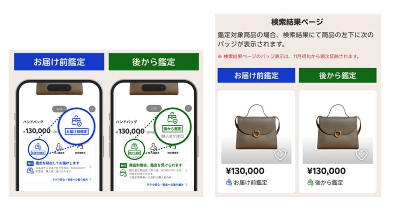 「ラクマ最強鑑定」における「お届け前鑑定」と「後から鑑定」の各機能は、事業者を除く個人ユーザーが出品するブランド品を中心に、「楽天ラクマ」が指定する400ブランド以上の商品が対象となります。各機能の対象商品には、検索結果のページおよび各商品の商品詳細ページに「お届け前鑑定」または「後から鑑定」の機能名をバッジとして表示します(注2)。なお、出品者、購入者がいずれかの機能を指定することはできません。
