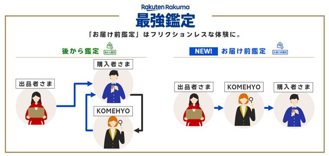 「ラクマ最強鑑定」は、二次流通における偽造品撲滅に貢献することを目的に、楽天がコメ兵と提携して提供するサービスです。2024年1月に本格提供を開始した「ラクマ鑑定サービス」では、商品到着後に購入者が検品を依頼し、「楽天ラクマ」指定の場所へ商品を送る「後から鑑定」機能のみでしたが、このたび、新たに対象商品を購入した際、購入者の手元に届く前に検品ができる「お届け前鑑定」機能の提供を開始しました。「お届け前鑑定」機能は、商品到着前に検品を行うことで購入者が商品を発送する手間がなくなり、検品済みの商品を受け取ることができ、取引完了までの期間が短縮できます。